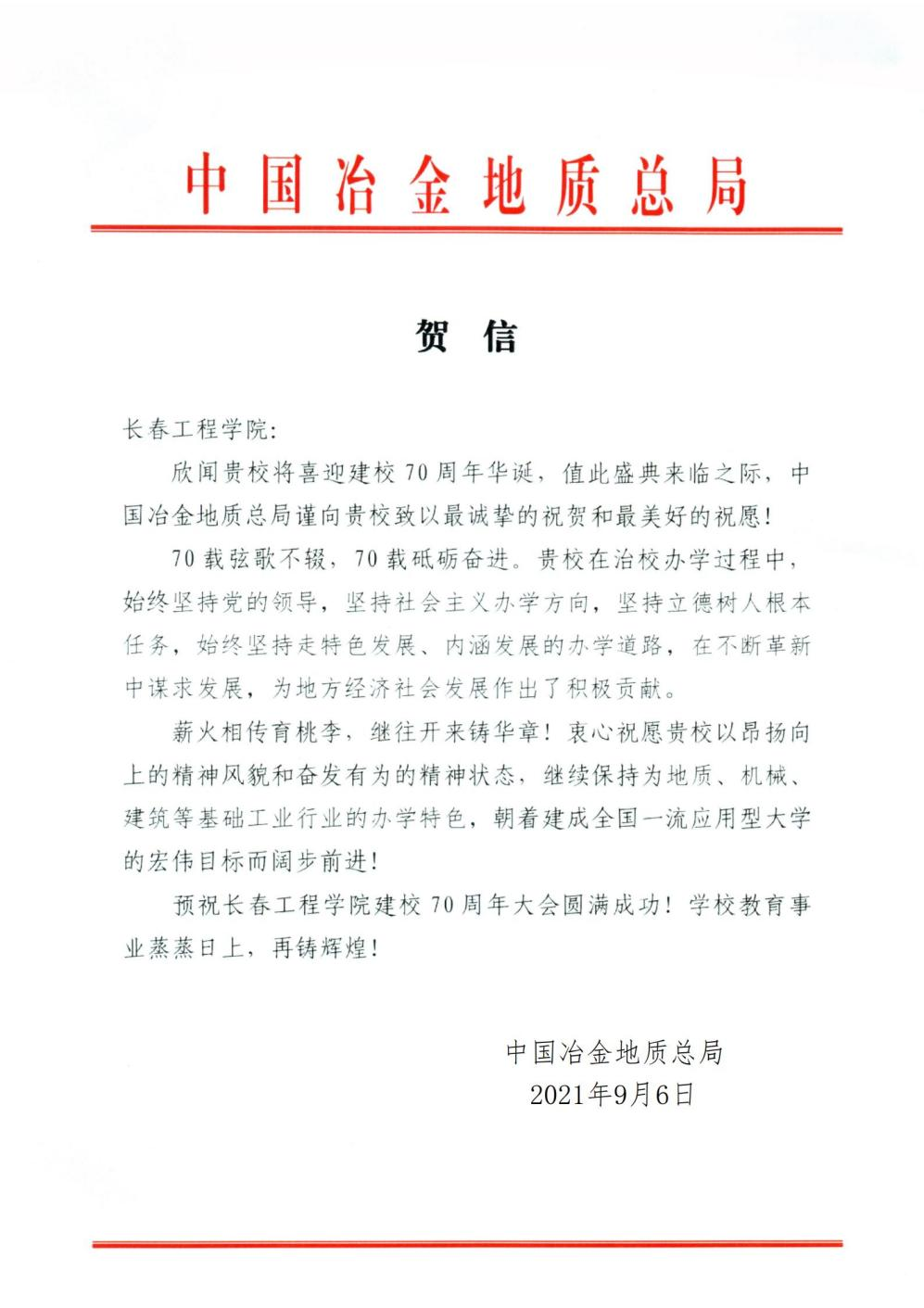 2021年9月8日,压球手机在线官网收到中国冶金地质总局发来的贺信,在建校70周年庆祝盛典来临之际,向压球手机在线官网致以了最诚挚的祝贺和最美好的祝愿!贺信全文如下: