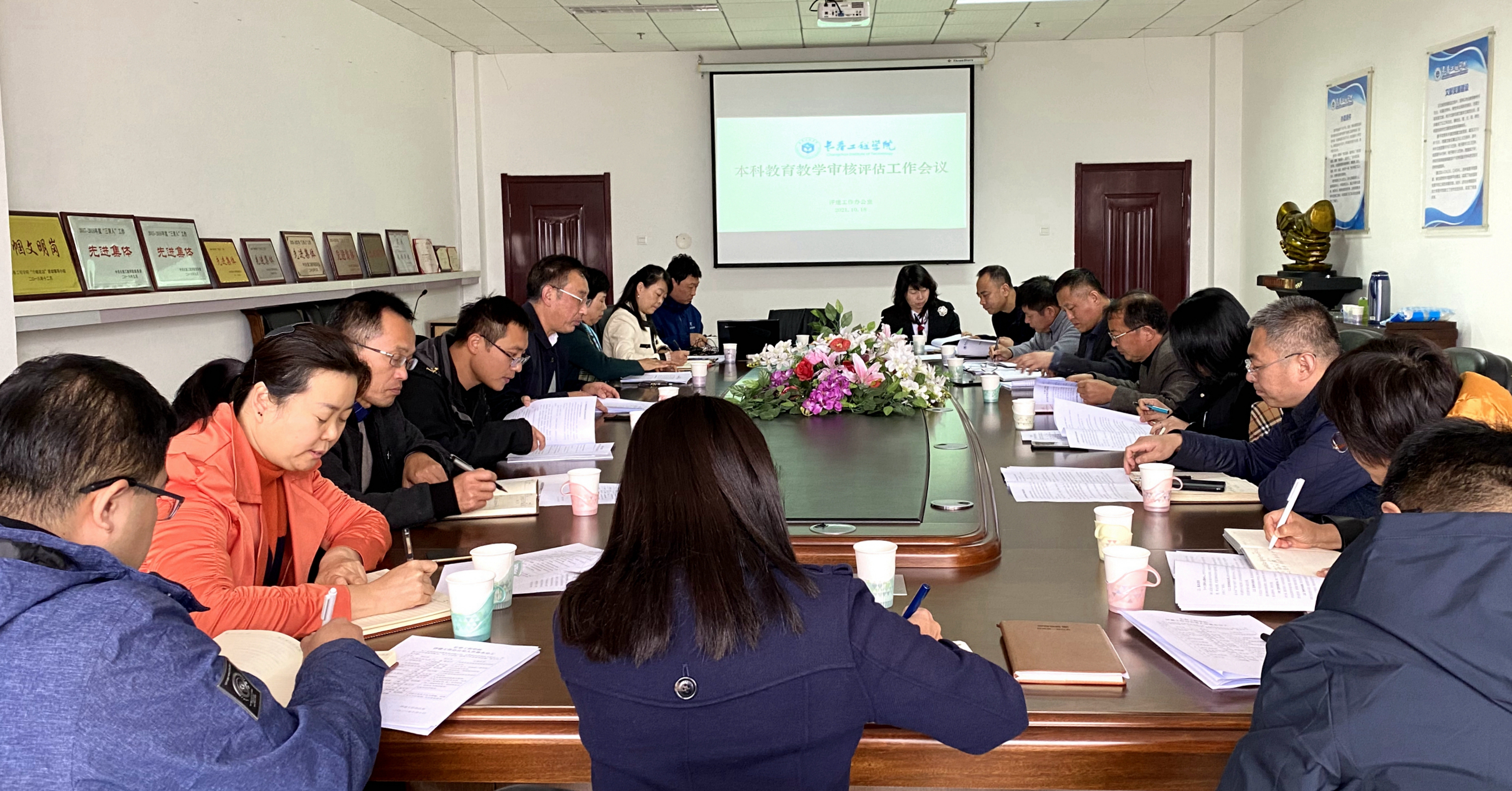 2021年10月18日下午,压球手机在线官网在逸夫图书馆八楼会议室召开了本科教育教学审核评估工作会议。审核评估工作各项目组副组长、评建工作办公室全体人员参加了会议。会议由副校长窦立军主持。