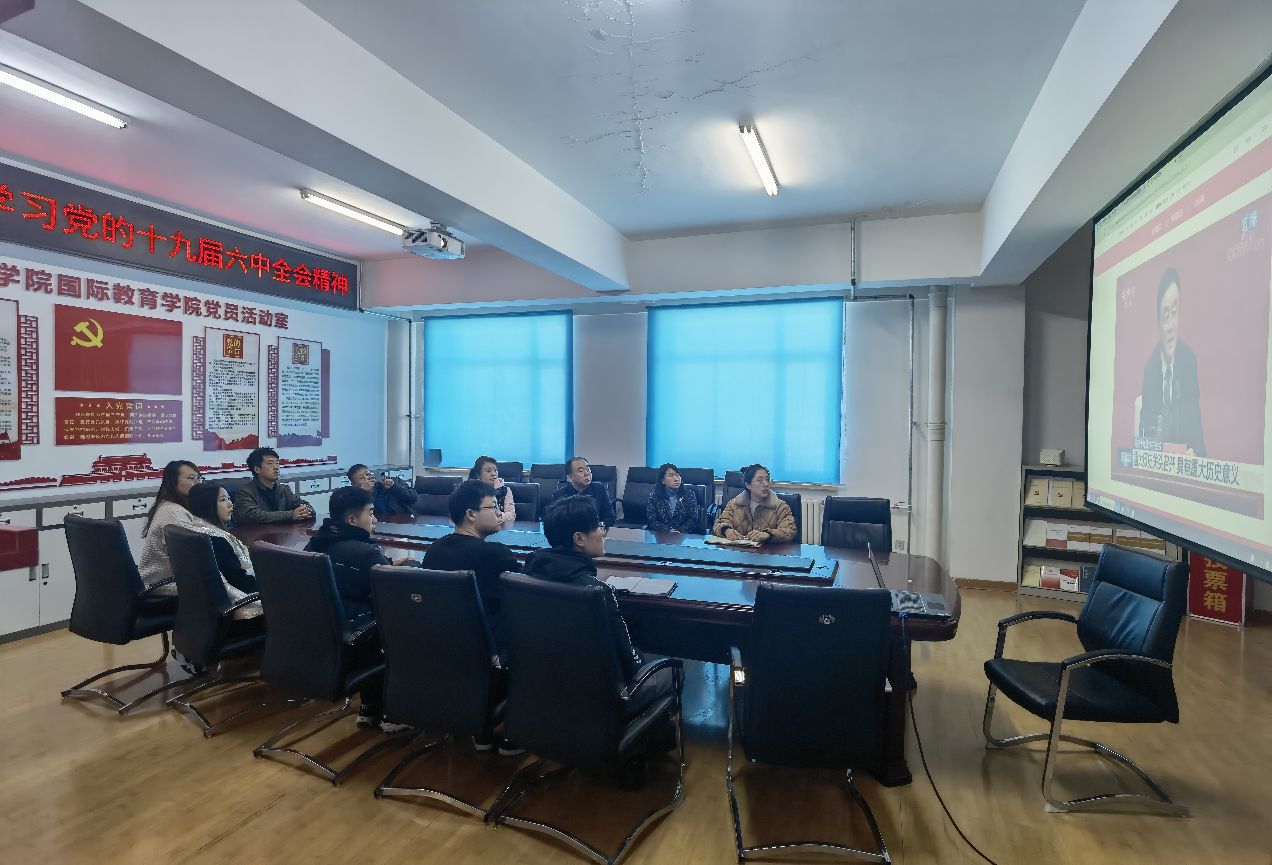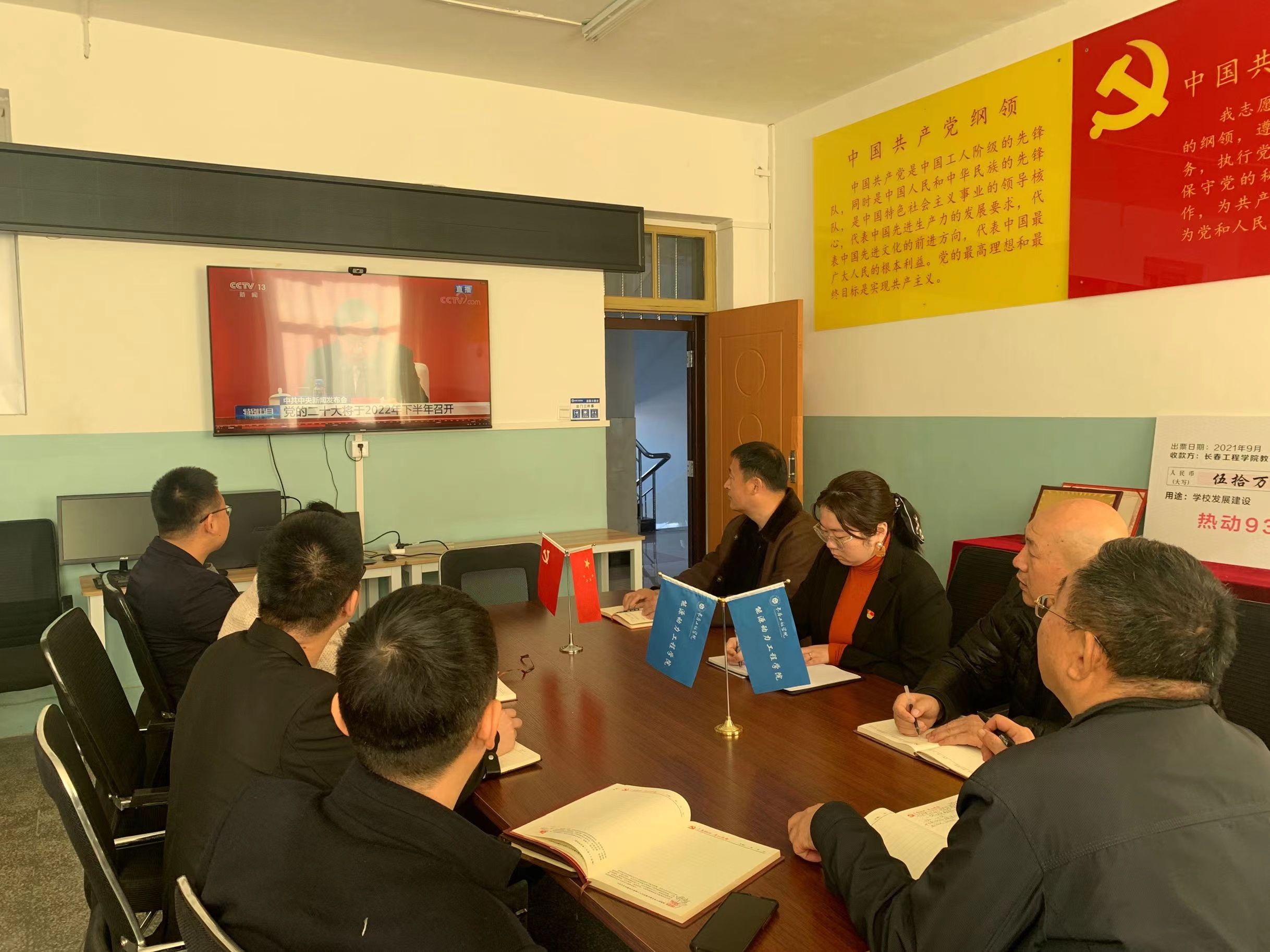 2021年11月12日上午10时,中共中央举行新闻发布会介绍党的十九届六中全会精神。压球手机在线官网党委高度重视,积极组织师生员工收听收看发布会。其中,压球手机在线官网领导班子成员、两委委员和相关职能部门负责人在办公楼第二会议室集中观看了发布会现场直播;各基层党委、党总支、直属党支部也结合实际组织本部门党员干部、教师、学生收看发布会现场直播。