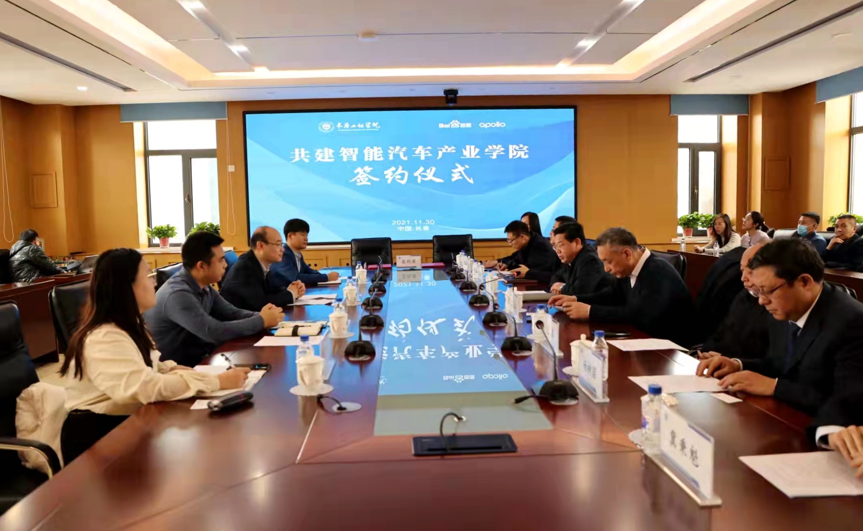 11月30日,我校与北京百度智行科技有限公司联合成立智能汽车产业学院,签约仪式在办公楼343会议室举行。北京百度智行科技有限公司东北三省总经理董斌、吉林省总经理张烁、东北三省教育行业代表丁小珑、智能网联高级解决方案专家张可欣,我校校长陈权、副校长窦立军参加仪式。
