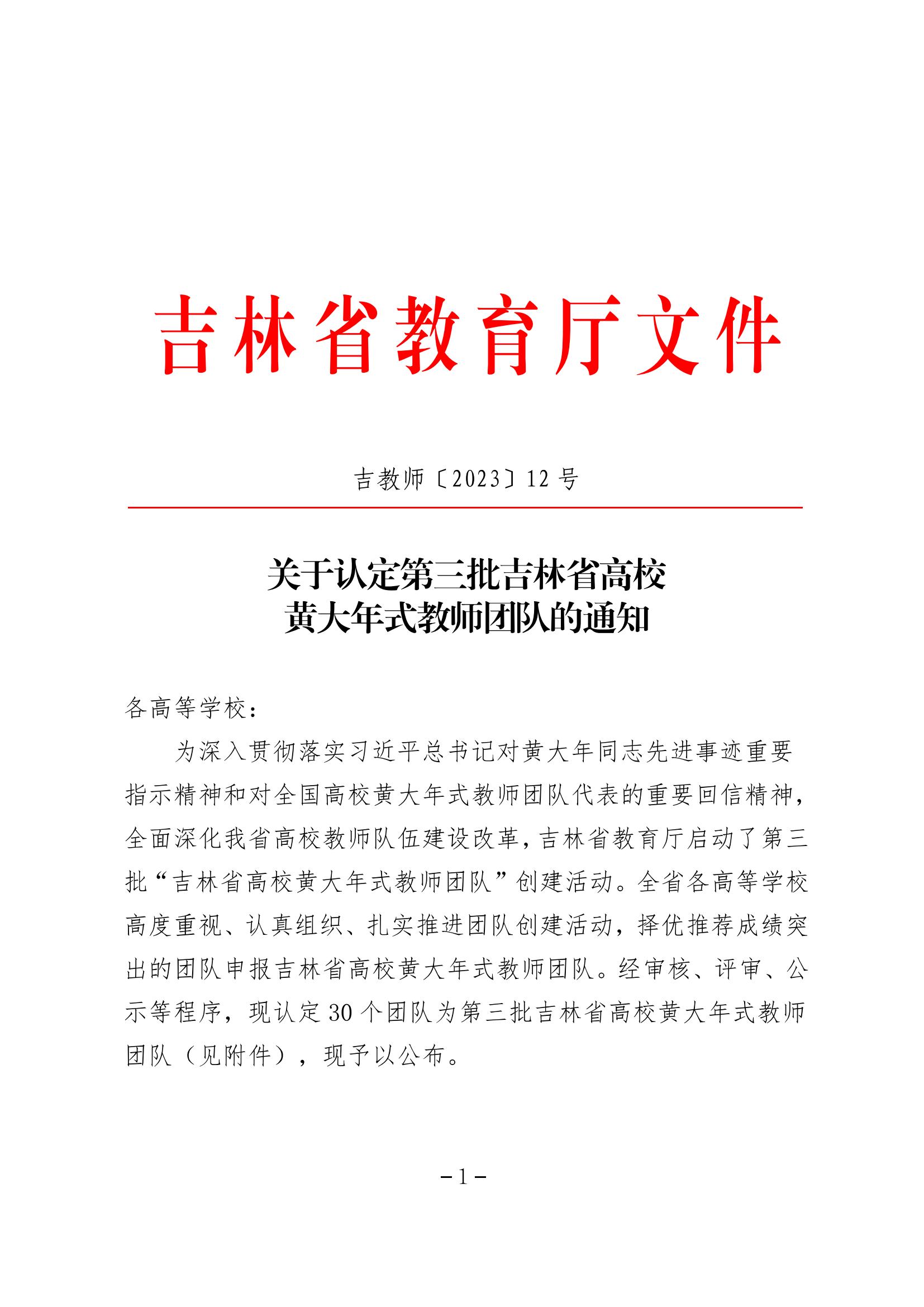 近日,吉林省教育厅开展第三批吉林省高校黄大年式教师团队创建活动,我校原副校长、土木工程学院窦立军教授负责的“土木工程教师团队”获批为“吉林省第三批高校黄大年式教师团队”。