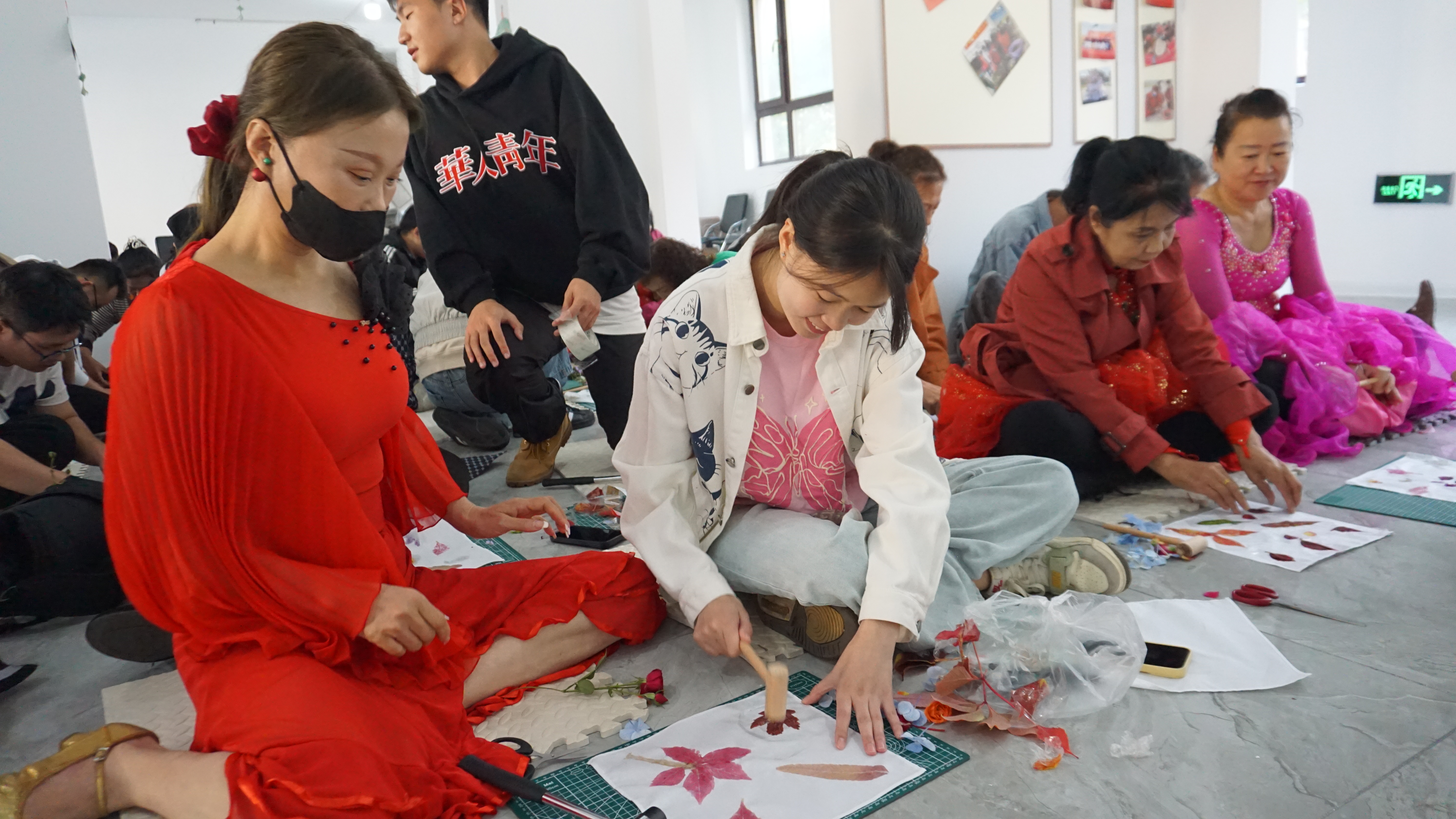 活动开始前,同学们为社区的居民介绍了中国非物质文化遗产植物拓染技术的发展历程,详细讲解了植物拓染技术之一——植物敲拓染的基本原理、应用场景和注意事项,并演示了植物敲拓染的制作步骤。随后,同学们协助参加活动的老人们制作植物敲拓染作品。大家发挥想象,自由创作,尽情体验植物拓染的乐趣。