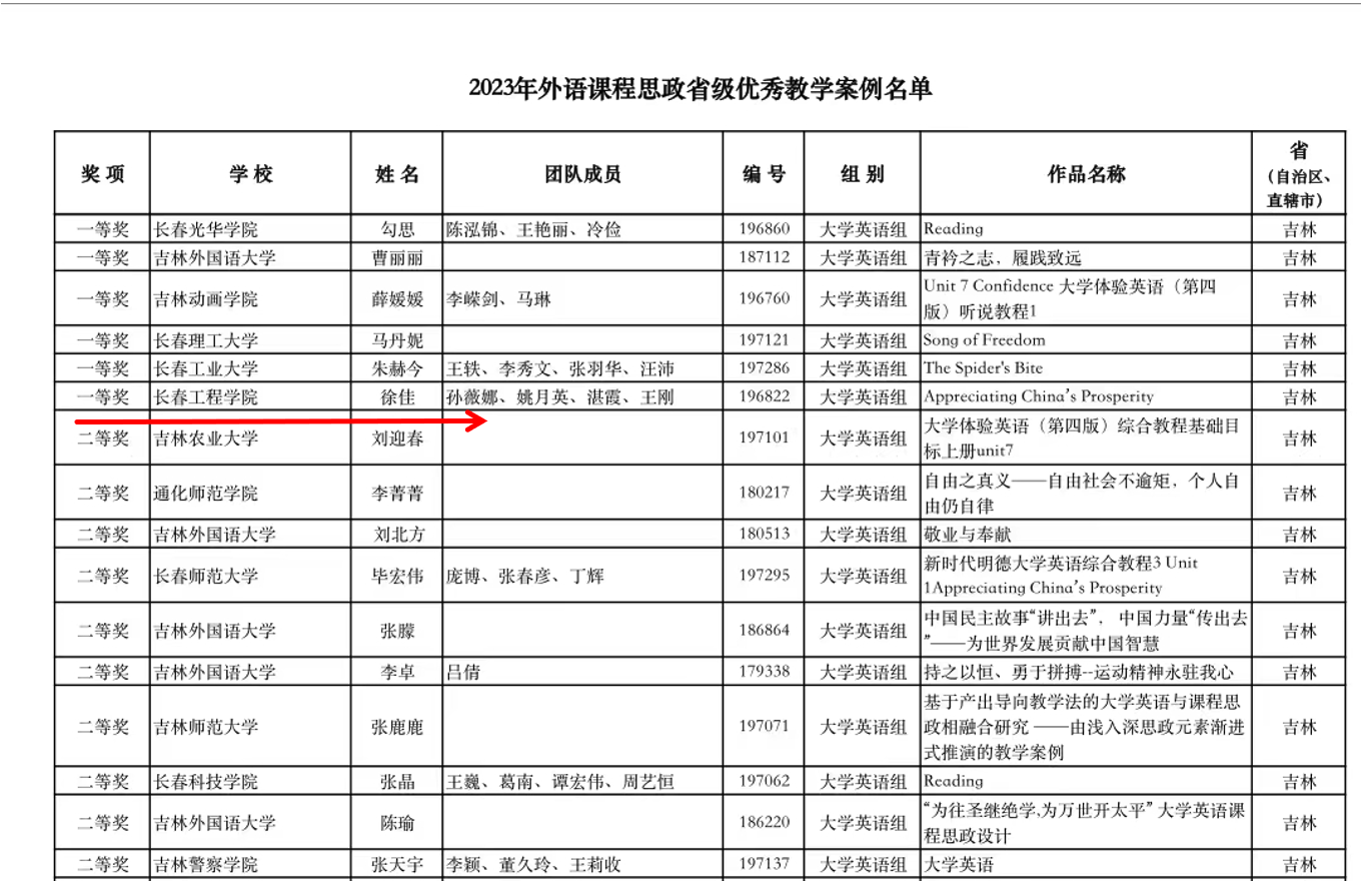 近日,由吉林省高校公共英语类专业教学指导委员会与高等教育出版社联合举办的2023年吉林省大学英语课程思政优秀教学案例征集评选活动,在经过近半年的多轮角逐后终于落下帷幕,我校外国语学院教师徐佳及其团队创作的作品脱颖而出,荣获一等奖。