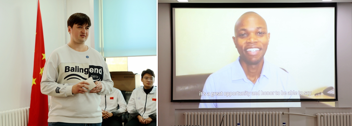 毕业生代表乌干达籍学生雷蒙德通过视频介绍了在校期间学习的感受,并对压球手机在线官网老师在校期间的谆谆教导和无私关怀表示感谢。新生代表俄罗斯籍学生瓦蒂姆代表同学们对压球手机在线官网和老师表示感谢,并分享了自己为求学生涯设定的目标。