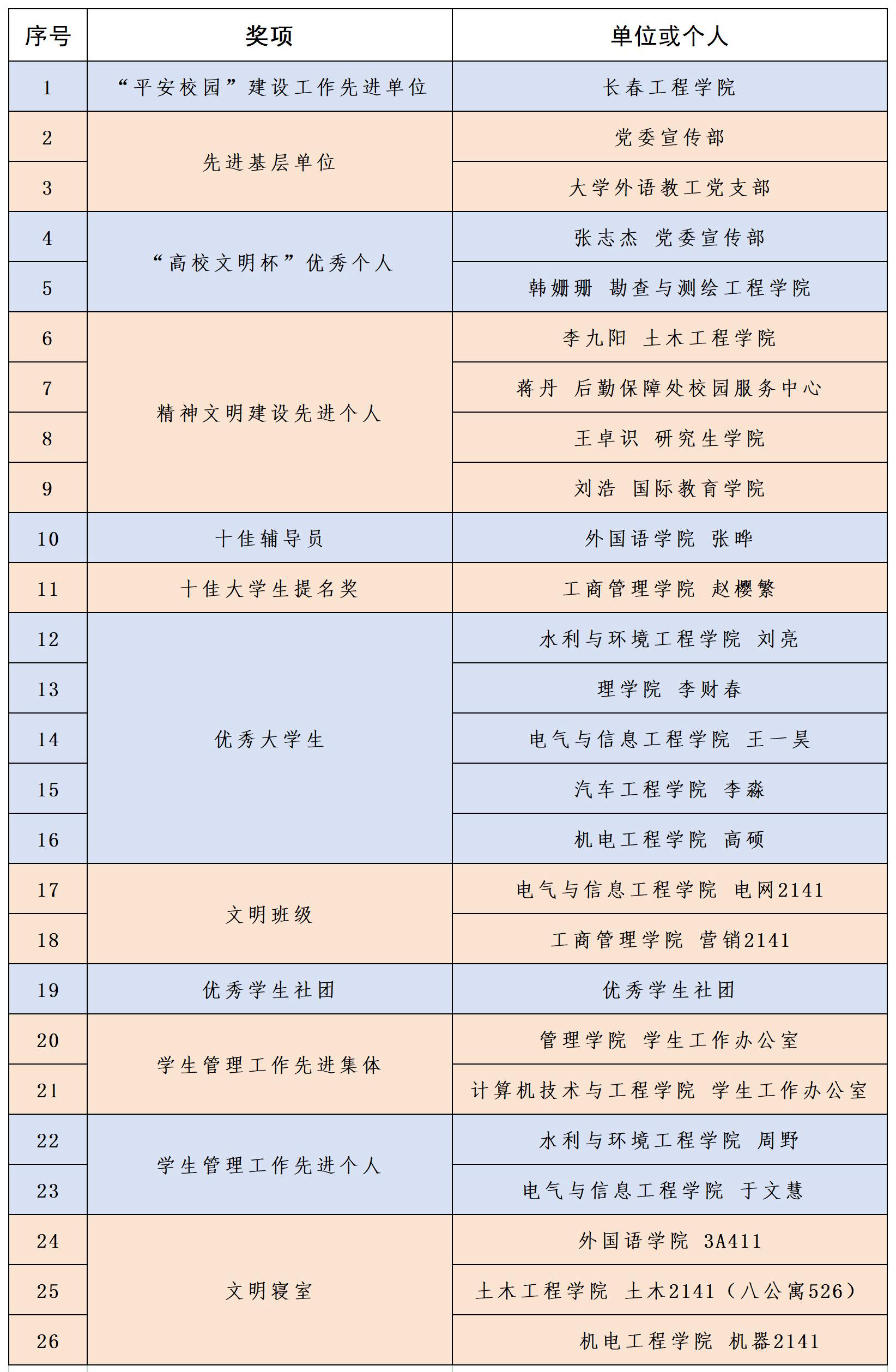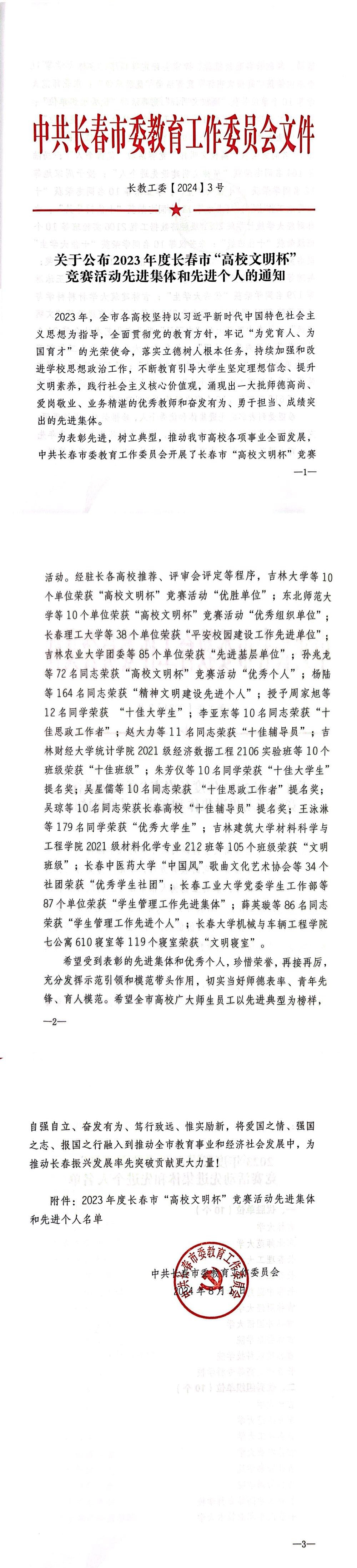 近日,长春市委教育工作委员会公布了2023年度长春市“高校文明杯”竞赛活动先进集体和先进个人名单,我校获得先进基层单位、“高校文明杯”优秀个人等荣誉26项。