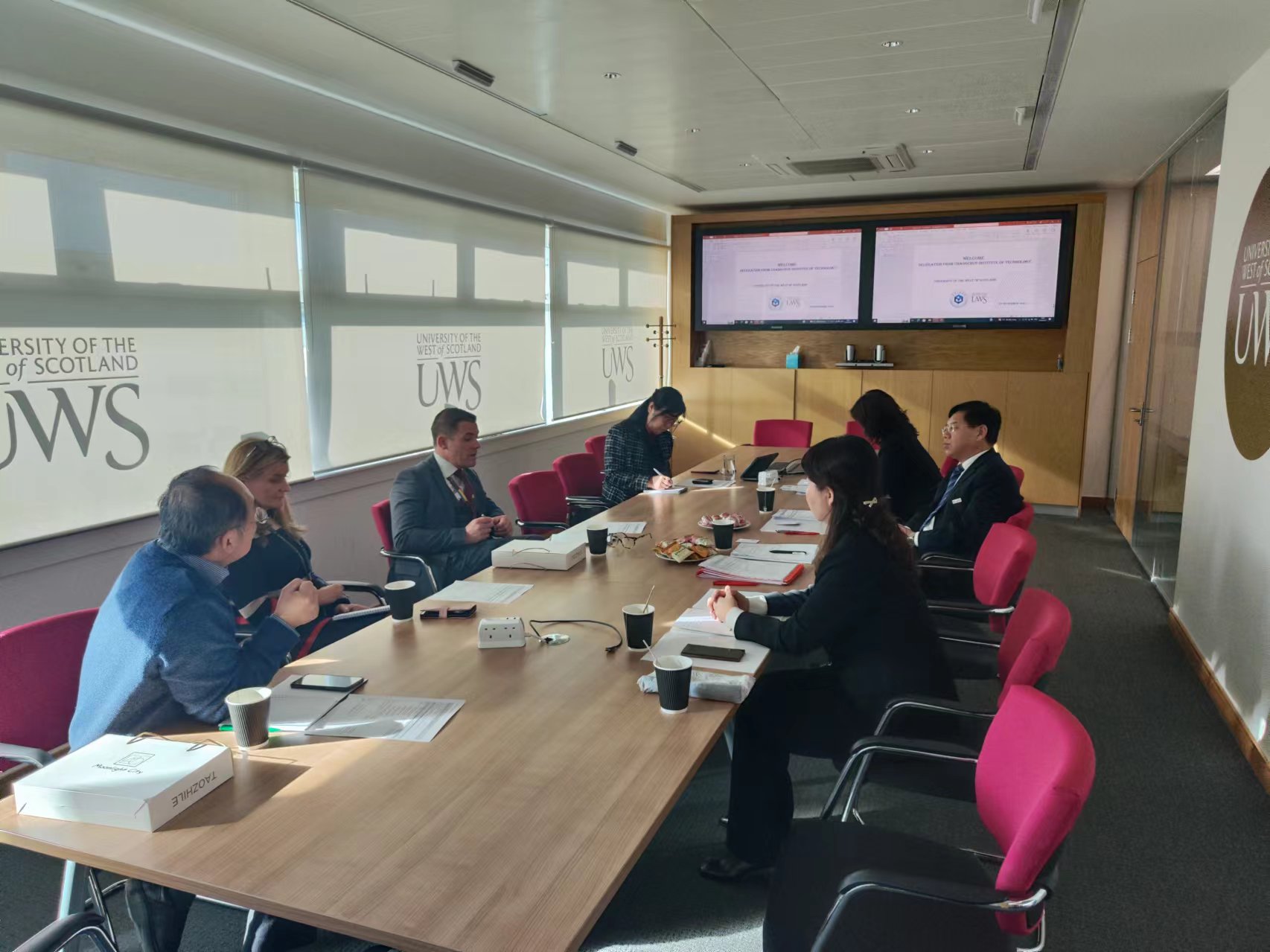 会上,西苏格兰大学工程、计算机及物理科学学院院长,英方项目联络人,我校国际交流处、教务处负责人,就两校合作办学项目发展情况进行了总结交流,重点探讨了在人工智能、大数据处理、智能建造等专业领域开展校际科研合作,就联合培养博士项目交换了意见,对我校教师出国进修培训、外教来华教学组织与安排等工作进行了详细研讨。