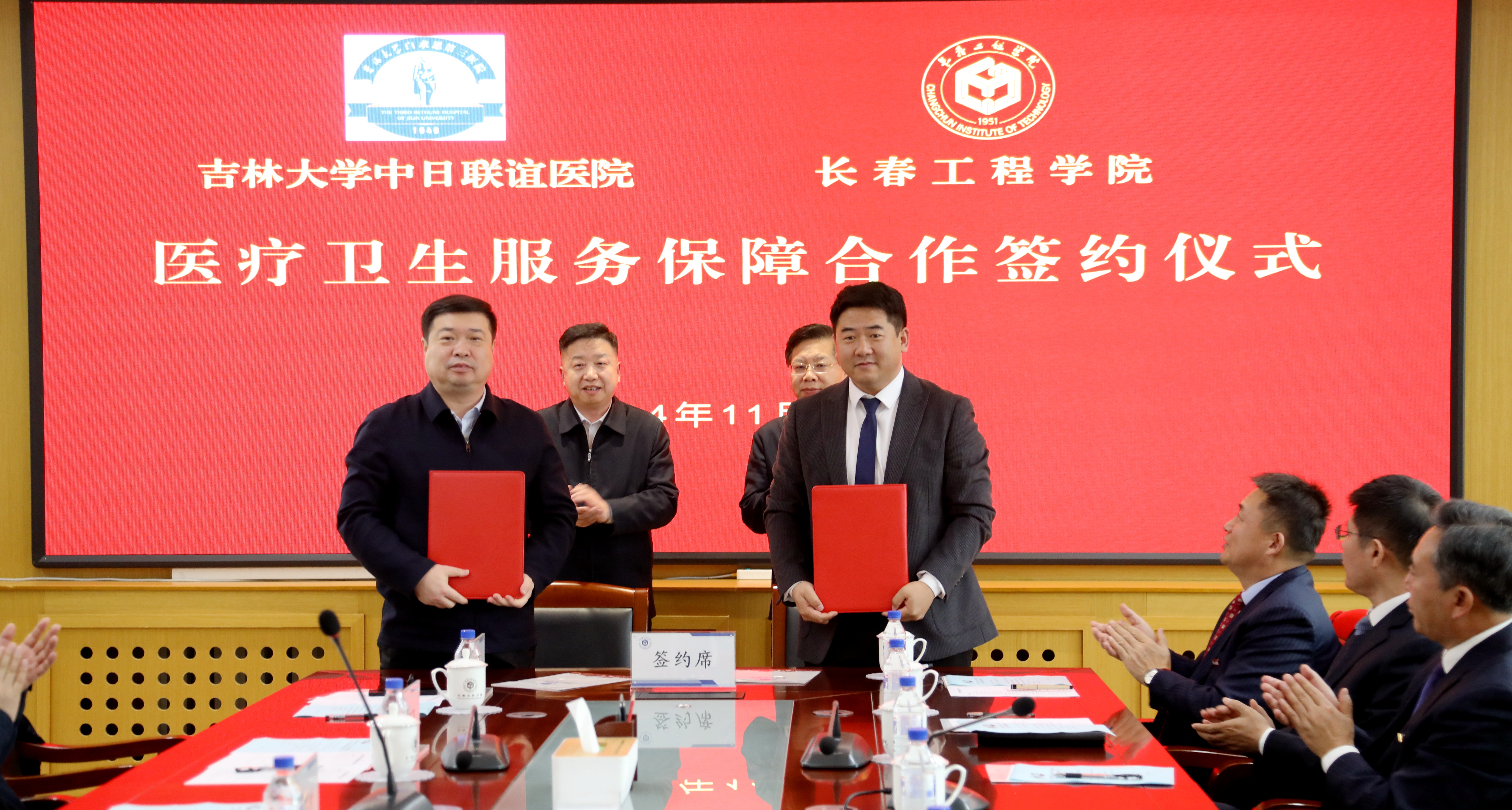 11月18日,压球手机在线官网与吉林大学中日联谊医院医疗卫生服务保障合作协议签约仪式在压球手机在线官网第二会议室举行。压球手机在线官网党委书记陈权,校长宋立军,党委副书记刘兆国,纪委书记王延博,副校长尹志刚、王朝勇、张邦成、韩威,吉林大学中日联谊医院党委书记杜建时,副院长高宇飞、刘俊志、顾锐,纪委书记张朝晖,党委副书记李旭东出席签约仪式。仪式由宋立军校长主持。