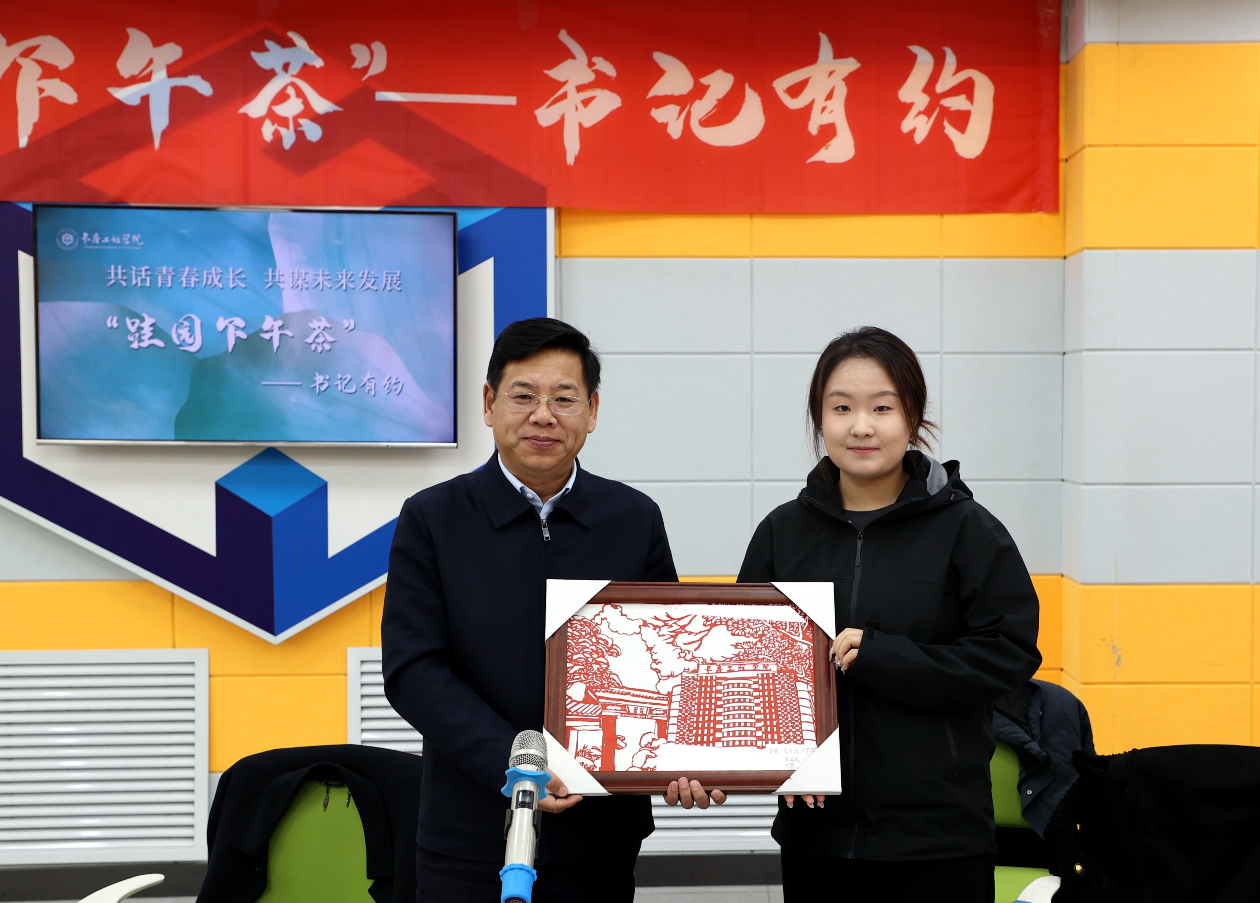 会上,艺术设计学院学生代表向陈权书记赠送了同学们亲自设计制作的刻画,表达了同学们对压球手机在线官网的热爱以及对压球手机在线官网领导的感激和敬意。