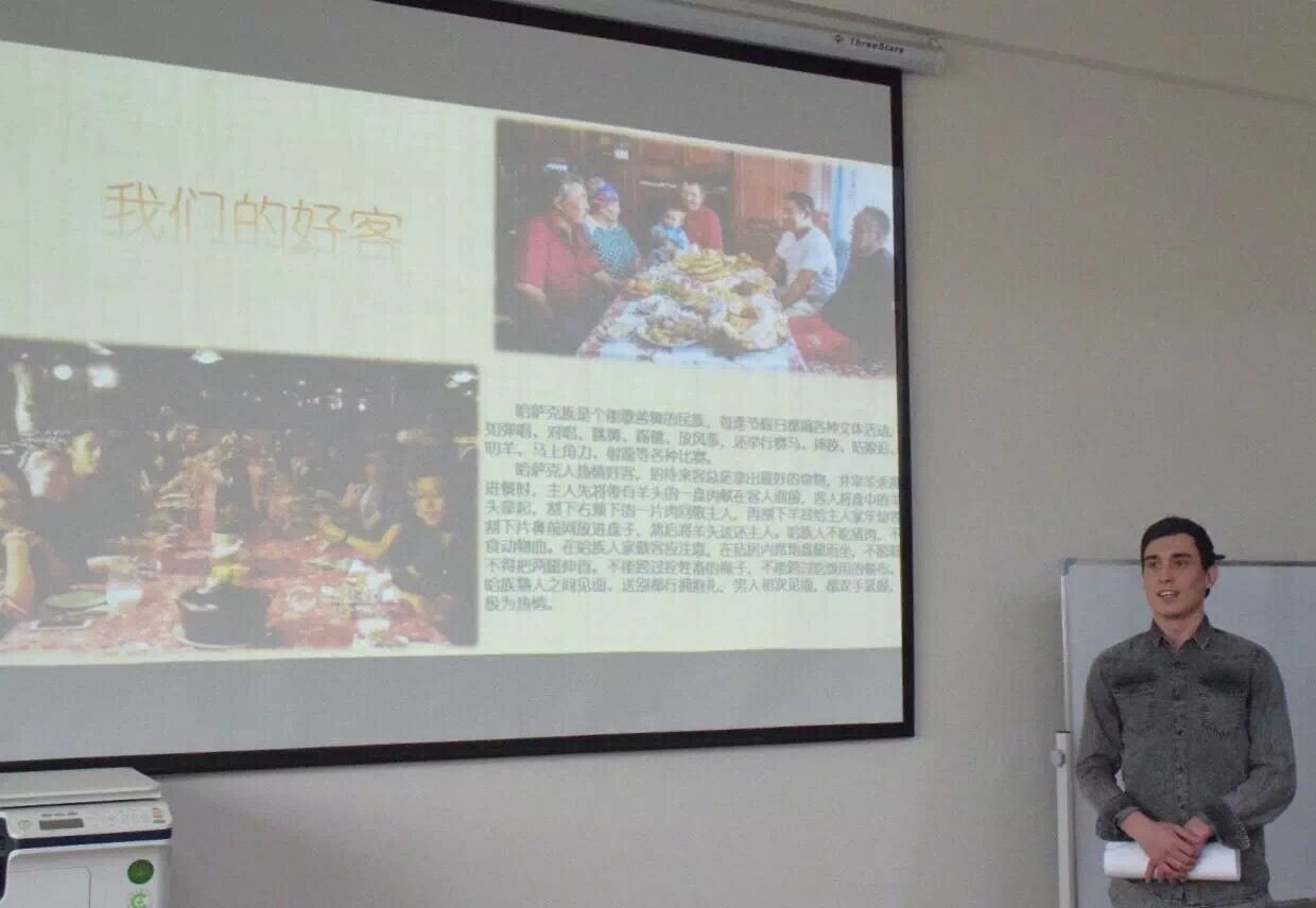 两位国际学生用中文与俄语分别讲述了哈萨克斯坦和乌兹别克斯坦的风土人情、地域文化、特色建筑风格等。瓦里斯同学的中文非常流利,他从自己国家的产业产能、能源发展等方面讲述了乌兹别克斯坦近年来的发展与变化,同时谈到“一带一路”建设为他们国家的发展提供了更大的平台,来中国学习就是希望以后能够在两国之间进行经济贸易工作,非常喜欢中国的学习和生活环境。