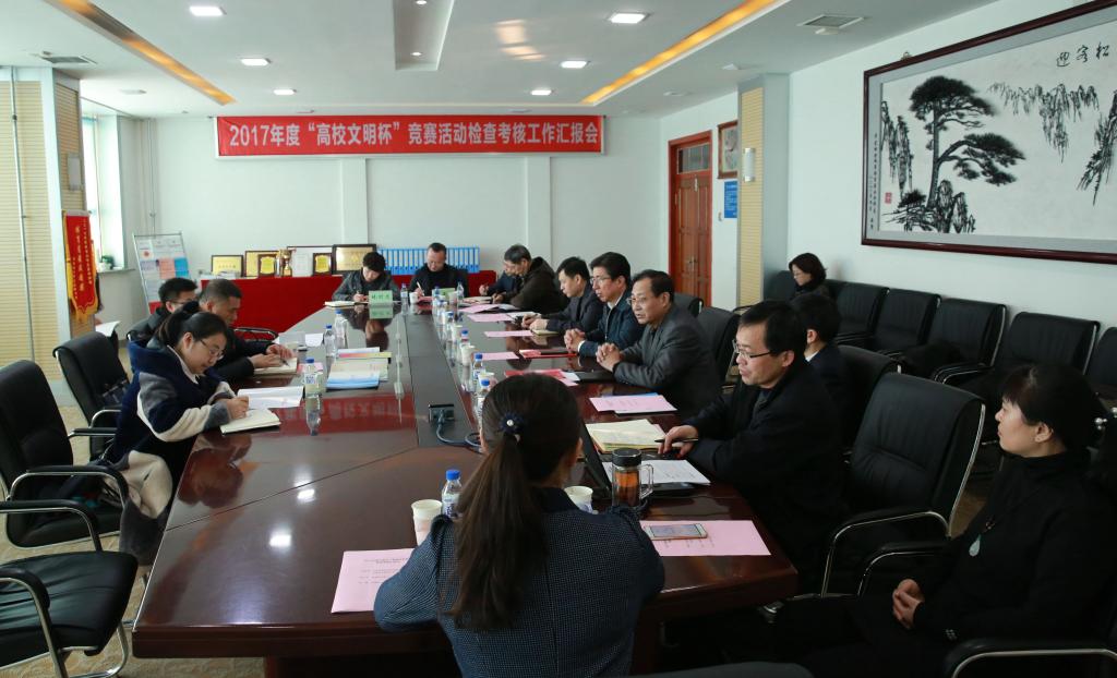 温义生副书记围绕学习宣传贯彻党的十九大精神,落实党建和思想政治工作的主体责任,构建平安和谐校园等方面,向检查组汇报了我校2017年度精神文明建设工作总体情况。