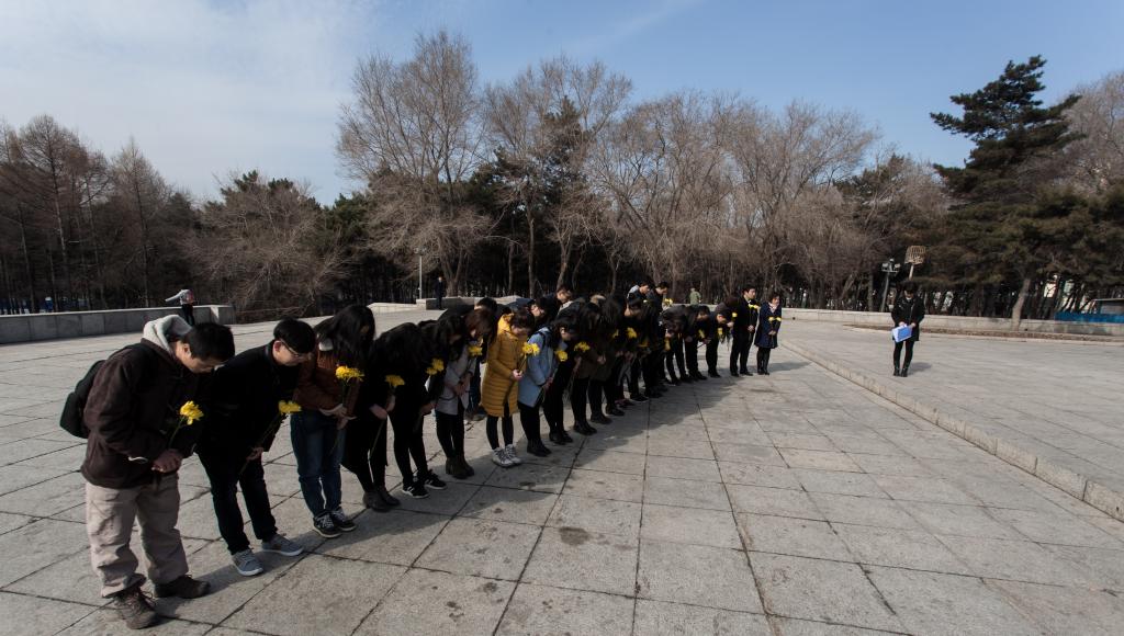 全体师生面向革命纪念碑默哀1分钟,寄托对革命烈士的无限哀思。随后,在潘殿琦院长、赵庆昕书记、张天天老师带领下,全体师生敬献了鲜花,以表纪念。