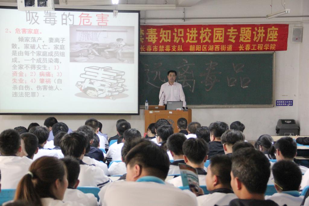 长春市禁毒支队、朝阳区司法局社区矫正办公室、长春市奋进强制隔离戒毒所、宽平大路派出所、湖西街道人大工委、湖西司法所、湖西街道等单位工作人员来到我校,为同学们作了报告。在报告中,长春市禁毒支队陈洪涛副队长为大家详细讲解了毒品的危害、种类以及防范措施,警戒同学们要远离容易出现毒品的相关场所,如酒吧、夜总会等,同时要远离沾染毒品的人,做好自我保护。现场的同学们通过报告增强了识别、防范、抵制合成毒品的意识,提高了自我保护能力。