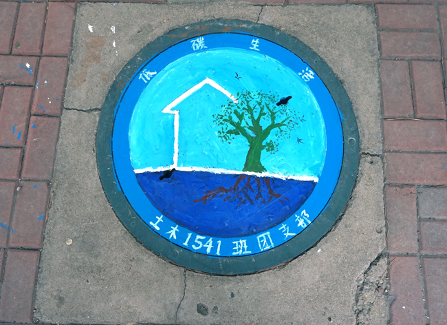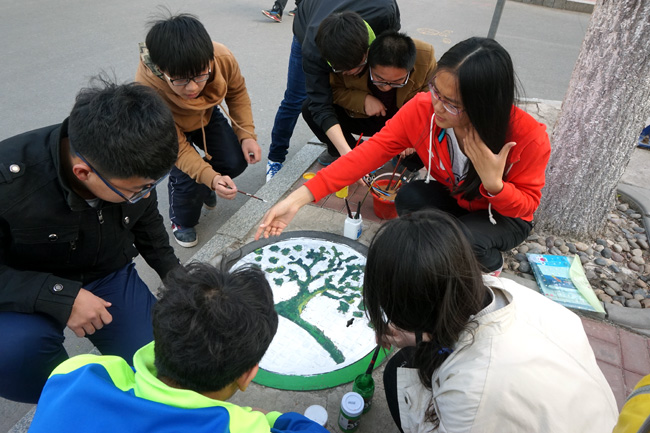 本次活动以 “井盖上的地球”为主题,进行环保创意宣传画活动。志愿者们自由选取了校园中不同地方的污水井盖设计并绘制。活动旨在改变以往生硬的宣传形式,通过在井盖上创作与环保有关的图案既美化了校园,又提醒了人们注意环保,爱护人类共同的地球母亲。在乍暖还寒的春日下午1时,同学们不畏寒风吹拂,分别在图书馆、5教、6教门前等区域展开了第一阶段的绘画创作。伴随着一支支刷子的飞舞,一笔笔颜料的添加,原本无趣的井盖变成了一幅幅环保创意图。茂密的森林、鲜艳的花朵在原本灰暗的井盖上慢慢呈现出来,传达出创作者对大自然的美好向往,呼吁大家保护自然环境;井盖上动物矫健的身影、可爱的容貌,传递出创作者对野生动物的喜爱,提醒人们加强对野生动物的保护;一切的一切,无不彰显着作者推崇的绿色环保理念......。