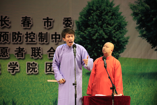 长春泰友曲艺社的演员们以单弦和相声的表演形式,将防艾的相关知识和防艾重要性巧妙穿插在节目中,语言诙谐幽默,现场笑声不断,赢得同学们的阵阵掌声。同时,为了使宣传更加具有全面性,我校还举办了以“携手同行、预防艾滋、珍爱健康、促进和谐”为主题的世界艾滋病日大型宣传签名活动。