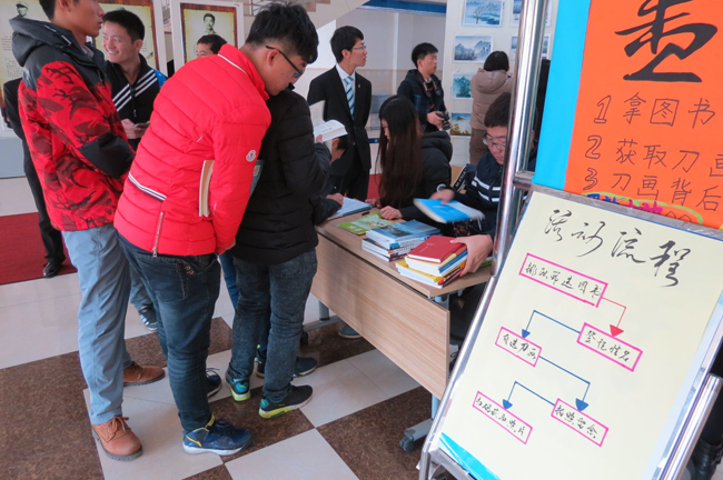 在本次活动中,同学们只需要向图书馆捐赠一本图书就可以获得刀画协会成员绘制的精美刀画一张。活动现场气氛十分热烈,同学们积极踊跃参与,带着事先准备好的图书到馆排队捐赠,在管委会的同学对捐赠图书进行筛选、登记书目信息之后,就可以自选刀画,并与换取的刀画拍照留念。活动过程中共计92位同学参与捐书,捐赠图书176本,换取刀画87张。