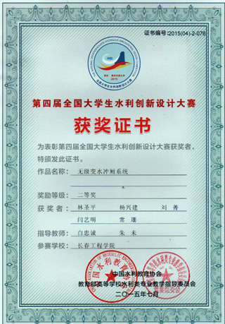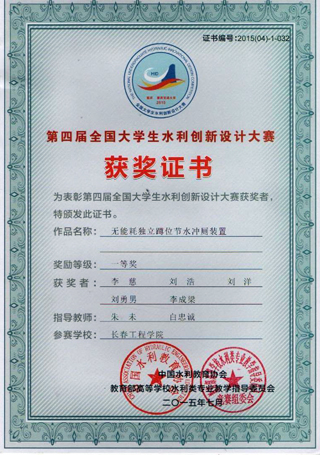 在重庆举行的2015年“第四届全国大学生水利创新设计大赛”竞赛中,我校水环学院朱未老师指导、水环学院李慈、刘浩、刘洋、刘勇男和电信学院李成梁同学共同设计的参赛作品《无能耗独立蹲位节水冲厕装置》荣获本届大学生水利创新设计大赛一等奖;水环学院白忠诚老师指导、水环学院林圣平、杨兴建、刘菁、闫艺明和常珊设计的参赛作品《无极变水冲厕系统》荣获本届大学生水利创新设计大赛二等奖。