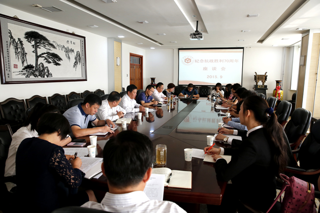 9月5日,压球手机在线官网在第七教学楼十楼会议室组织召开了纪念抗战胜利70周年师生座谈会,党办、人文社科部、组织部、宣传部、学生工作处、团委等部门负责人及部分师生代表参加了座谈会。