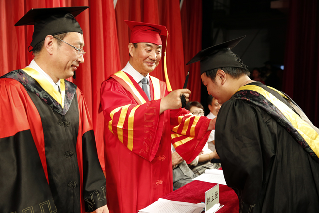 党委书记李春生、校长韩立强为毕业生代表拨流苏,与会领导向毕业生代表颁发毕业证书、学位证书和奖励证书。