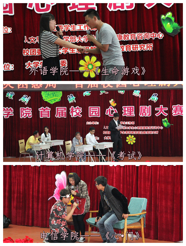 为了拓展我校大学生思想政治教育的途径和载体,进一步推动大学生心理健康教育工作,以直观的方式将大学生微妙的心理活动展示出来,再现学生日常学习、生活中常见的心理矛盾与冲突,帮助学生正确认知自我,感悟生活,掌握必要的心理调适方法,我校学生工作处、人文与社会科学部大学生心理健康教育咨询中心、校团委和大学生思想政治教育研究所联合举办了首届校园心理剧大赛。比赛自今年4月启动,由各学院经过精心排练和层层选拔,最终有6支参赛队伍登上了决赛的舞台。