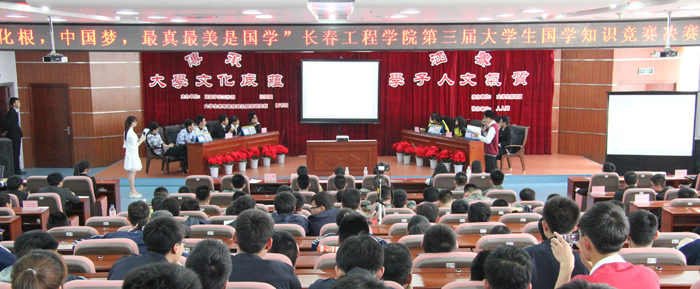 国学贯穿于古今,是中国优秀传统文化的精髓。为培育和践行社会主义核心价值观,传承中华优秀传统文化,助力我校大学文化建设,增强宣传思想工作的感染力和吸引力,提升广大长工程学子文化修养。4月26日,由学生工作处、校团委、大学生思想政治教育研究所和图书馆联合主办,大学生思想政治素质建设委员会承办,人人网协办的“文化根,中国梦,最真最美是国学”第三届大学生国学知识竞赛决赛在逸夫图书馆八楼报告厅举行。主办单位的相关教师、各学院学生代表近300人现场观看了比赛。