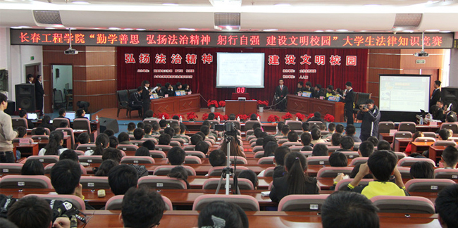 弘扬法治精神,提升法律修养,不仅是我校依法治校的重要内容,也是培养高级应用型人才的现实需求。经过初赛500余名学生的激烈角逐,最终十三支代表队39名选手脱颖而出,成功入围决赛。决赛分为“各抒己见”、“乘胜逐北”、“独占鳌头”三个环节,内容紧紧围绕宪法、刑法、教育法、道路交通安全法、知识产权法、文物保护法、民族宗教政策法规以及学生管理条例等内容,并将党的十八届四中全会精神融入其中。同时组委会还特意加大了涉及工程技术领域法律法规的比重,如合同法、公司法、劳动法以及工程施工领域的法律纠纷案例,这对于工程应用型大学生提前形成专业法律意识多有裨益。
