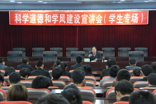校党委副书记吴占军教授为现场近200名高年级本科生代表做了生动的报告。吴书记的报告分两部分展开,一方面充分阐述了科学道德和学风建设的含义、重要性,列举了近年来违反科学道德的七种行为表现;另一方面,结合实际为同学们讲解如何塑造自己,注重自身科学道德和诚信品质。他希望广大本科生从学生时代起就培养诚信的品格和严谨的作风,重视科学方法,不断提高责任意识和自身人文素质。他要求本科生,尤其是学生干部,不仅要努力成为大家学习、生活、工作方面的典范,更要充分发挥带头作用,自觉遵守学术规范,做一名优良学术道德的传播者和践行者以及良好学术风气的忠实维护者。