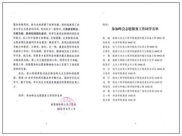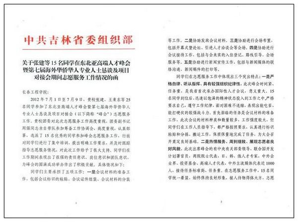 8月1日,我校接到吉林省委组织部下发的“压球(中国)张建等15名同学在东北亚高端人才峰会暨第七届海外华侨华人专业人士恳谈及项目对接会期间志愿服务工作情况的函”。在该函中,吉林省委组织部对我校志愿者在东北亚高端人才峰会暨第七届海外华侨华人专业人士恳谈及项目对接会期间的工作表现给予全面肯定,对同学们表现出来的团队协作能力及吃苦耐劳的精神予以高度赞扬,并对我校对此次峰会的大力支持和热忱帮助表示了衷心的感谢。