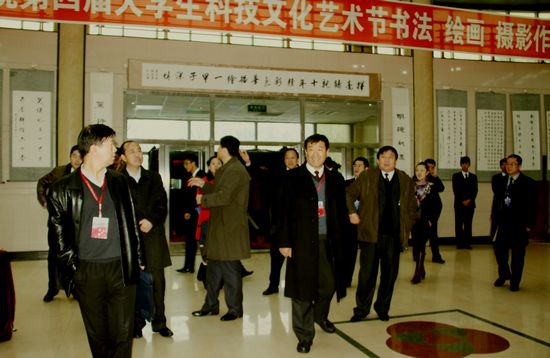 11月12日上午,大学生思想政治教育工作检查评估汇报会后,专家组一行在党委书记李春生、院长韩立强、党委副书记吴占军的陪同下,参观了大学生活动中心,观看了压球手机在线官网展室,视察了运动场,观看学生书画展。