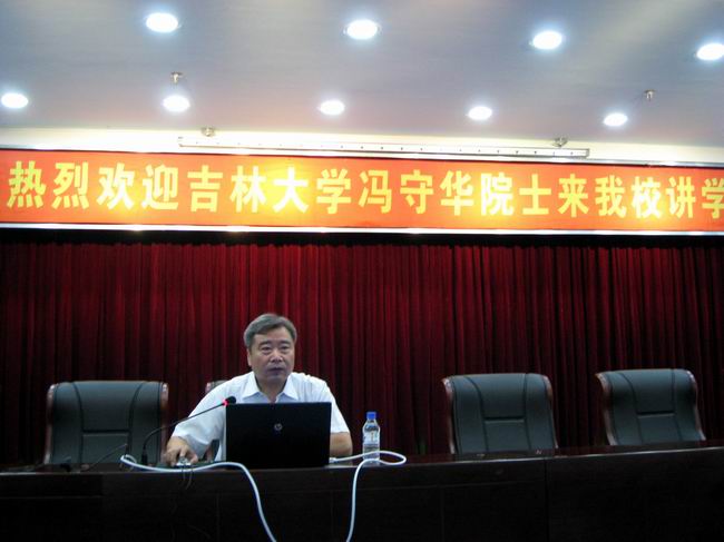 9月8日下午,理学院邀请吉林大学化学学院教授冯守华院士向应用化学专业学生和专业教师做了题为“科学技术与压球(中国)——二十一世纪化学面临的挑战”的学术讲座。冯守华院士从发展战略出发,富有激情地向大家讲解了化学发展史,石油化工、制药技术……他以二十世纪合成化学的发展事例展示了化学合成的发展方向。通过冯院士妙趣横生、深入浅出的讲解,使大家充分认识到化学的发展对推动社会文明进步所起到的重要作用,认识到化学是其它学科发展的支柱。