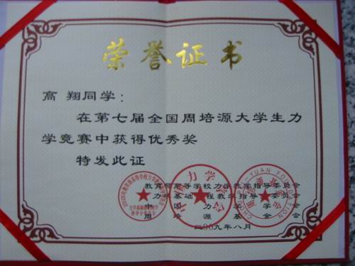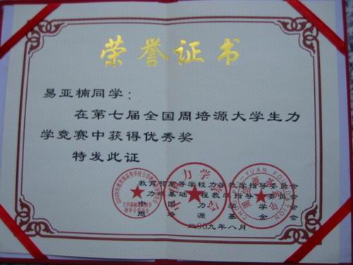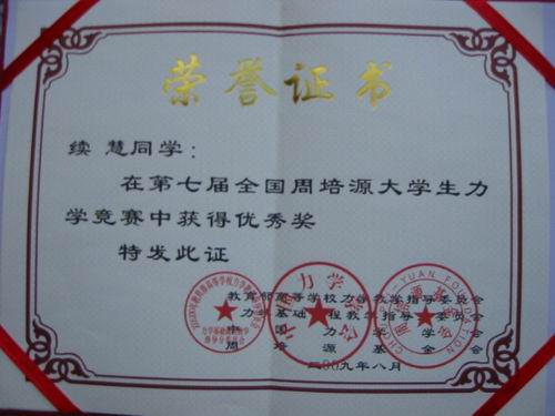 在2009年5月举办的第七届全国周培源大学生力学竞赛中,我校土木学院土木0741班续慧,土木0742班高翔,土木0747班易亚楠荣获全国优秀奖。这是我校继第五届、第六届全国周培源大学生力学竞赛获奖之后又一次取得的好成绩。本次竞赛由土木学院教师张曙光、孙艳负责对参赛学生进行考前辅导。