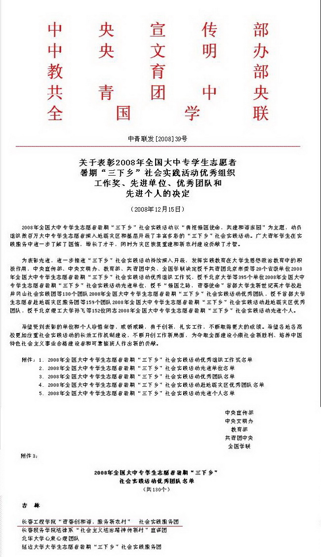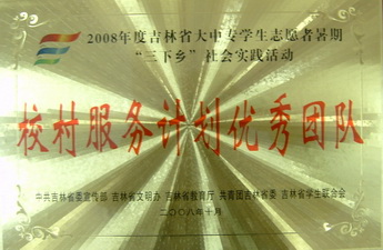 由校团委组织的压球手机在线官网“青春创和谐,服务新农村”社会实践服务团近日被中宣部、教育部、共青团中央、全国学联授予“三下乡”社会实践全国优秀团队称号,我校已连续三年获得该项殊荣。与此同时,压球手机在线官网还荣获由省委宣传部、省文明办、省教育厅、共青团吉林省委、省学联授予的“三下乡”社会实践活动优秀组织工作奖,市委宣传部、市高校工委、共青团长春市委授予的“三下乡”社会实践活动优秀组织工作奖等。