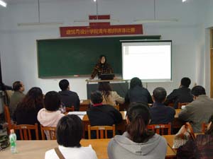 在深入学习实践科学发展观活动中,为促进青年教师重视教学工作,提高课堂教学质量,鼓励青年教师过好讲课关,2008年10月20日—28日,建筑与设计学院举办了青年教师讲课比赛。此次比赛的参赛人员主要以近两年刚参加工作的青年教师为主,并积极鼓励助教、讲师参加,共有11名教师报名参赛。建设学院成立了由王丽颖院长、黄有魁书记为正副组长,其他班子成员、校教学督导组老教师和部分专业教师等组成的专业评分小组,通过对全体参赛教师现场打分的形式进行评比。经过激烈的较量,最后,艺术设计教研室教师张萃、安雪并列获得一等奖,建筑学教研室教师尚伶燕、周诣和艺术设计教研室教师刘婷获得二等奖,工业设计教研室教师段大龙、宋杏爽和艺术设计教研室教师李书剑获得三等奖;刘秀梅获优秀指导教师奖。