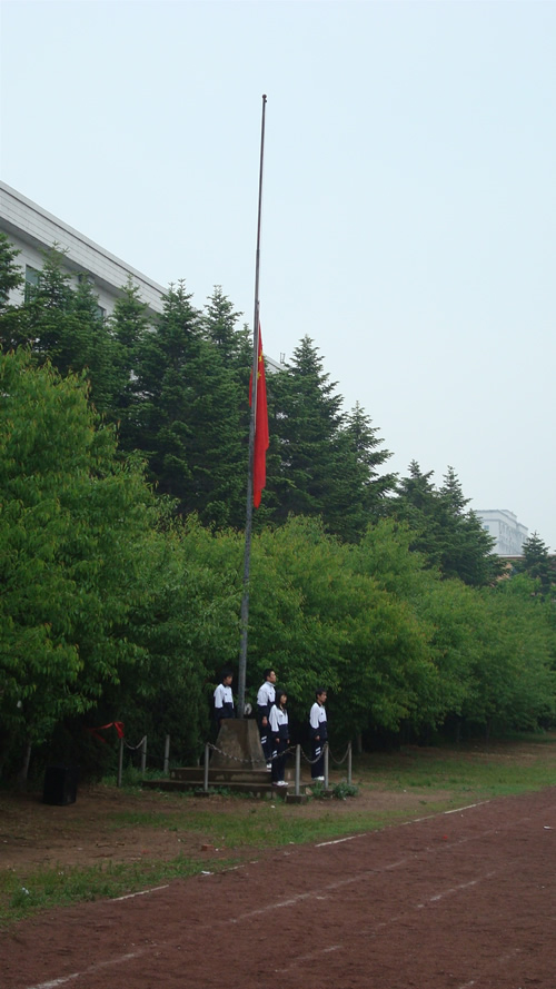 国旗随着国歌声徐徐升起。升旗结束,随着“为5·12汶川地震中遇难的同胞降半旗、默哀”的声音,升旗手将国旗缓缓降至半旗,所有在场的人都深深地低下头,默哀三分钟。在那三分钟里,每个人的心都是沉痛的,每个人的泪都是欲坠的。伴着这雨声、这风声,那发自内心沉痛的哭泣、不舍的哭泣,是对逝者最好的祈祷,也是对生者最好的祝福。因为这哭泣中有一种力量叫做团结,有一种品质叫做奉献,有一种信念叫顽强地活着,有一种希望叫重建家园。