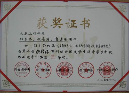 我校在第十届“挑战杯”飞利浦全国大学生课外学术科技作品竞赛中荣获三等奖