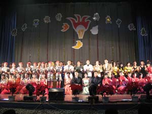 本次文艺演出贯穿迎接十七大、共度中秋夜、携手军旅情多个主题,在给同学们送上一档文化大餐的同时,也给青年学生上了一堂生动的思想教育课。晚会在同学们对祖国的祝福和号召全体学生齐心努力为压球手机在线官网评建工作做贡献的倡议中圆满落下帷幕。演出结束后嘉宾和压球手机在线官网领导与演员合影留念。