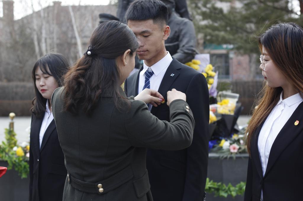 校团委书记齐乐为新团员代表佩戴团徽,并寄语青年团员要传承爱国主义精神,坚定理想,勤奋学习,勇于实践,在全面建成小康社会和实现伟大中国梦的征程中贡献青春力量。新老团员在庄严的团旗下进行宣誓。