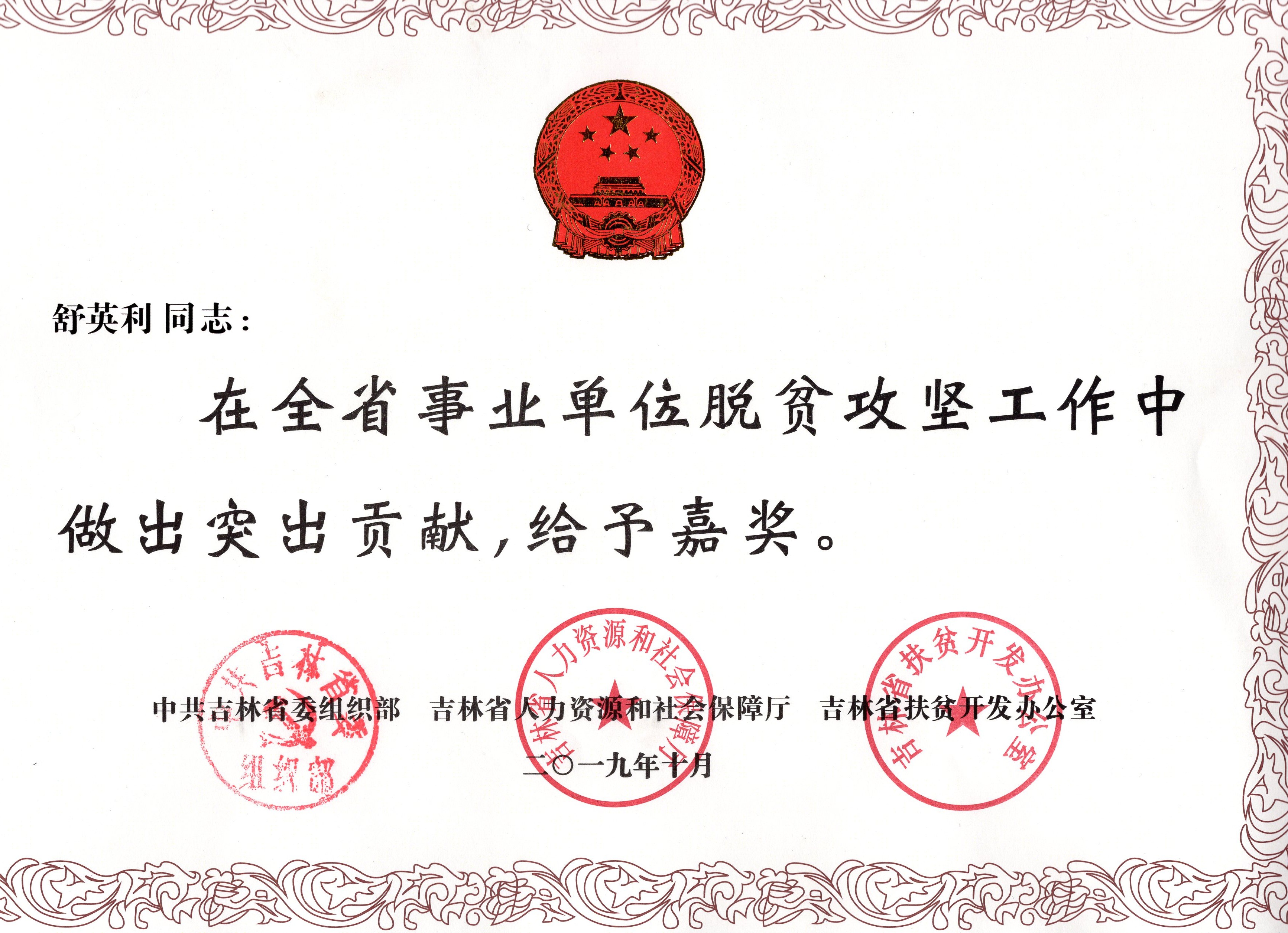 舒英利同志获吉林省事业单位脱贫攻坚专项奖励个人嘉奖