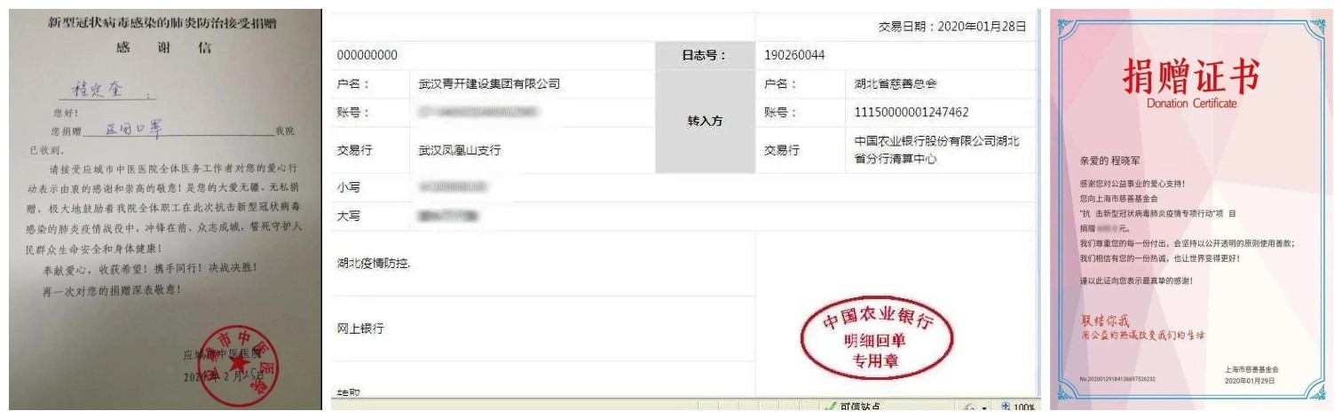(从左至右分别为暖通专业82级校友程定奎、工民建专业82级校友韩用权、自动化专业07级校友程晓军以个人或企业的名义进行社会捐赠的证明)