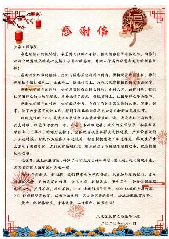 我校收到洮北区脱贫攻坚领导小组发来的感谢信