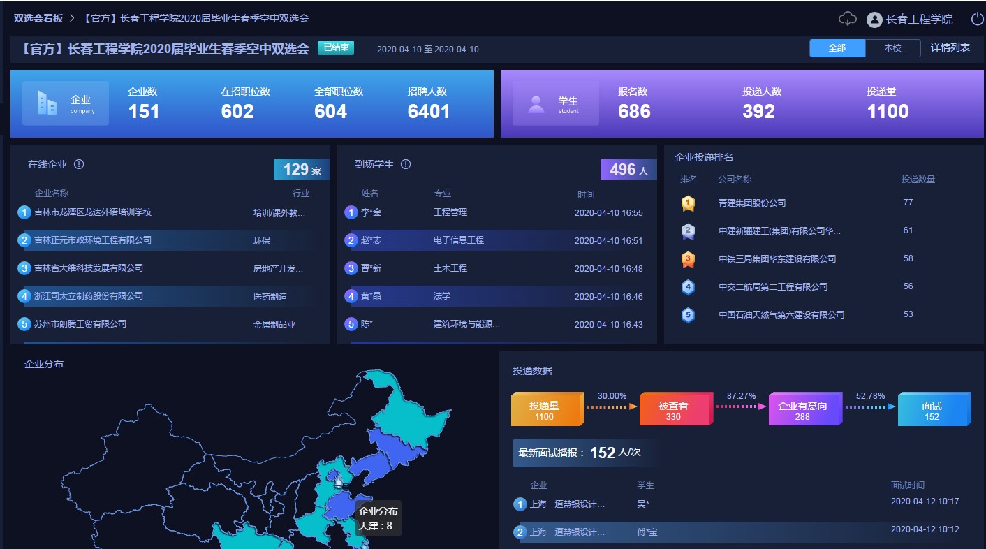 为做好教育部提出的24365校园招聘活动,进一步推进我省2020届高校毕业生网络招聘工作深入开展,鼓励广大毕业生留省就业,我校作为“菁智汇吉 生根筑梦”省内重大项目、重点企业网络专场招聘会分会场,于2020年4月10日成功举办了2020届毕业生吉林省重点企业网络视频双选会,这也是自疫情防控以来我校成功举办的第三场网络视频双选会。本次网络视频双选会有151家企业参会,其中吉林省企业51家,涵盖了电力、能源、建筑、制造、采矿、水利水电、信息传输、软件开发和金融管理等10余个行业,提供就业岗位602个,需求人数6400余人,参会毕业生686人,企业累计收到简历1000余份。通过在线问答、视频面试,当日约有200余人达成签约意向;其中房地产、建筑、计算机、电力、教育培训等行业关注度比较高。