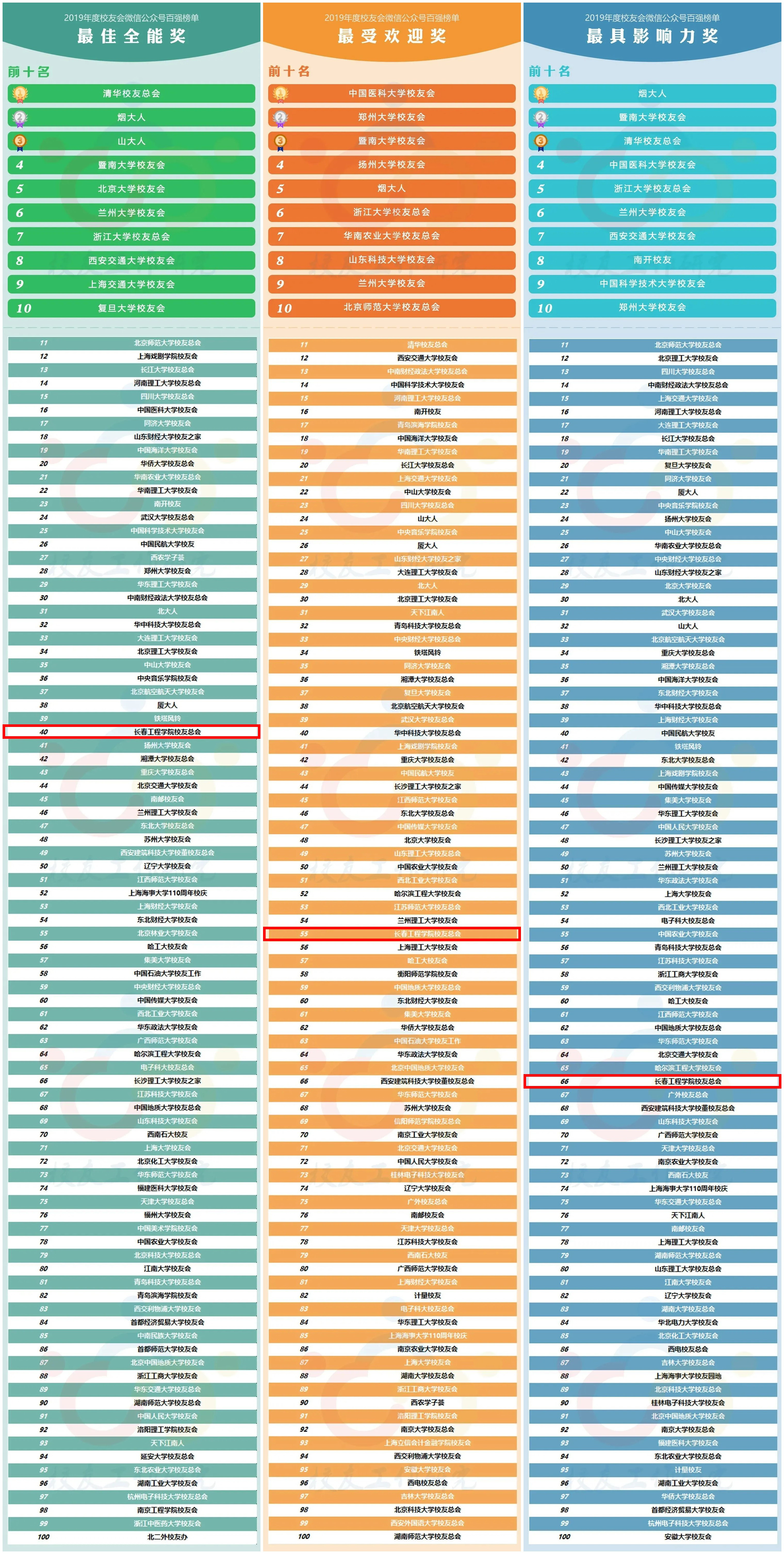 4月13日,“2019年度全国高校校友会公众号百强榜单”发布,“压球手机在线官网校友总会”微信公众号分别位列“最佳全能奖”第40位,“最受欢迎奖”第55位,“最具影响力奖”第66位,以上三个榜单中,均位列吉林省高校第1位。