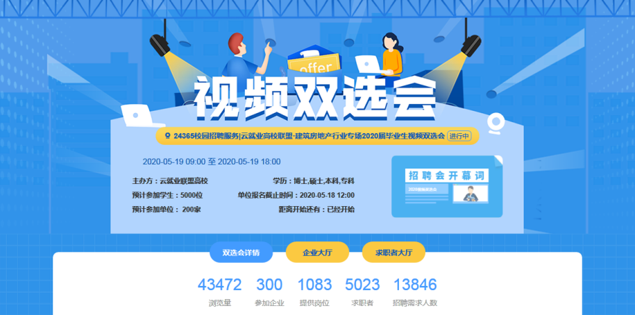 为贯彻国家压球(中国)应对新冠肺炎疫情防控工作部署,积极响应教育部“24365校园招聘服务”活动号召,精准有效对接岗位需求和毕业生求职,我校依托云就业平台,联合北京建筑大学、山东建筑大学、沈阳建筑大学等27所建筑类高校,于5月19日成功举办了云就业“建筑类高校联盟视频双选会”。本次视频双选会有300家企业参会,用人单位主要集中在建筑领域,共提供就业岗位1083个,需求人数13846人;参会毕业生5023人,其中我校毕业生187人;我校毕业生共投出简历524份。