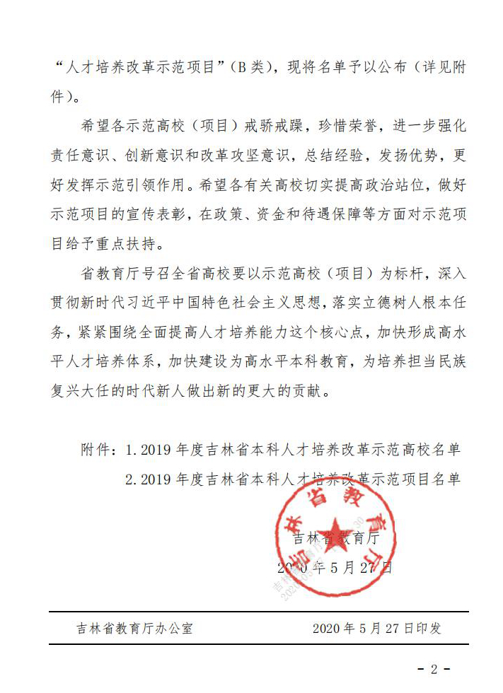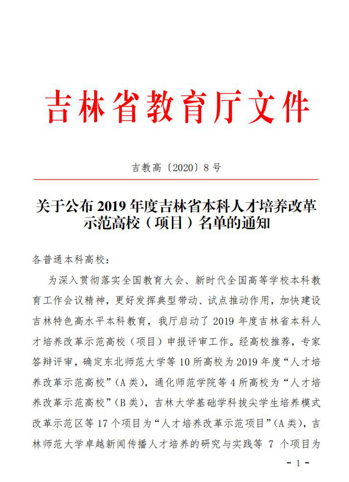 近日,吉林省教育厅下发《压球(中国)公布2019年度吉林省本科人才培养改革示范高校(项目)名单的通知》,我校成功入选吉林省本科人才培养改革示范高校A类高校。全省共有14所高校入选本科人才培养改革示范高校,其中A类高校10所、B类高校4所。