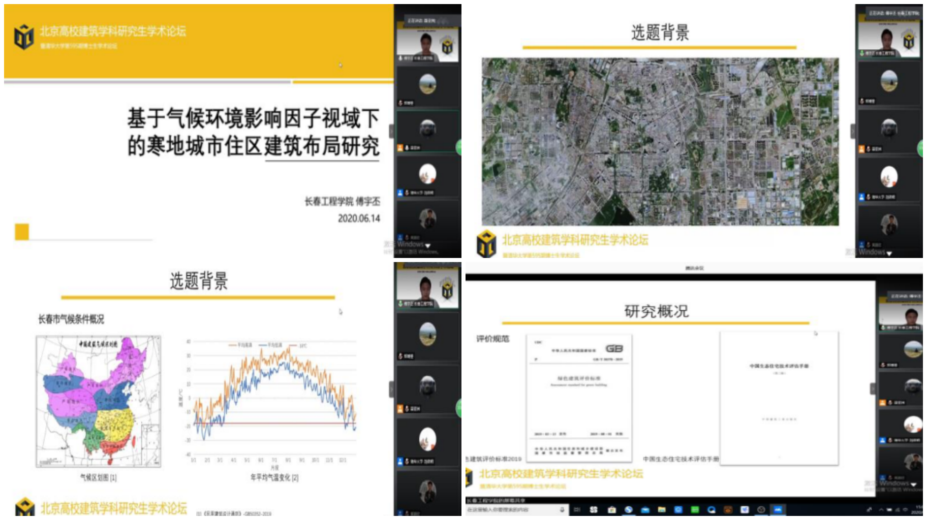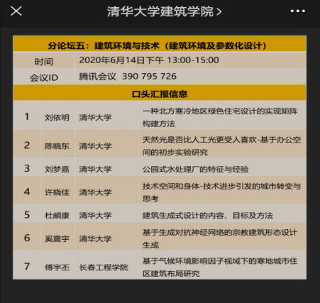 6月13日-6月14日,北京高校建筑学科研究生学术论坛暨清华大学第595期博士生学术论坛在腾讯会议线上会议平台举行。本届论坛以“FOR ALL”为主题,希望整合建筑、城市规划、风景园林、建筑技术科学、建筑环境工程、地理、历史、社会、经济、公共管理等多学科成果,促进相关人才交流。