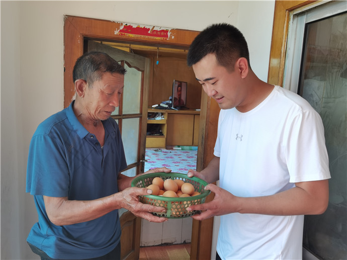宋长库与患病儿子相依为命,日子过得紧巴巴的。了解到这一情况后,蒋忠良为他提供了20只鸡雏,鼓励他发展庭院经济,眼下,院子里的土豆已硕果累累,鸡蛋和肉食鸡也可以卖了,蒋忠良有空便会“上门取货”。宋长库逢人便说,小蒋这孩子真不错,隔三差五就来家里帮忙干活儿,还负责卖家里的农产品,太感谢他了!
