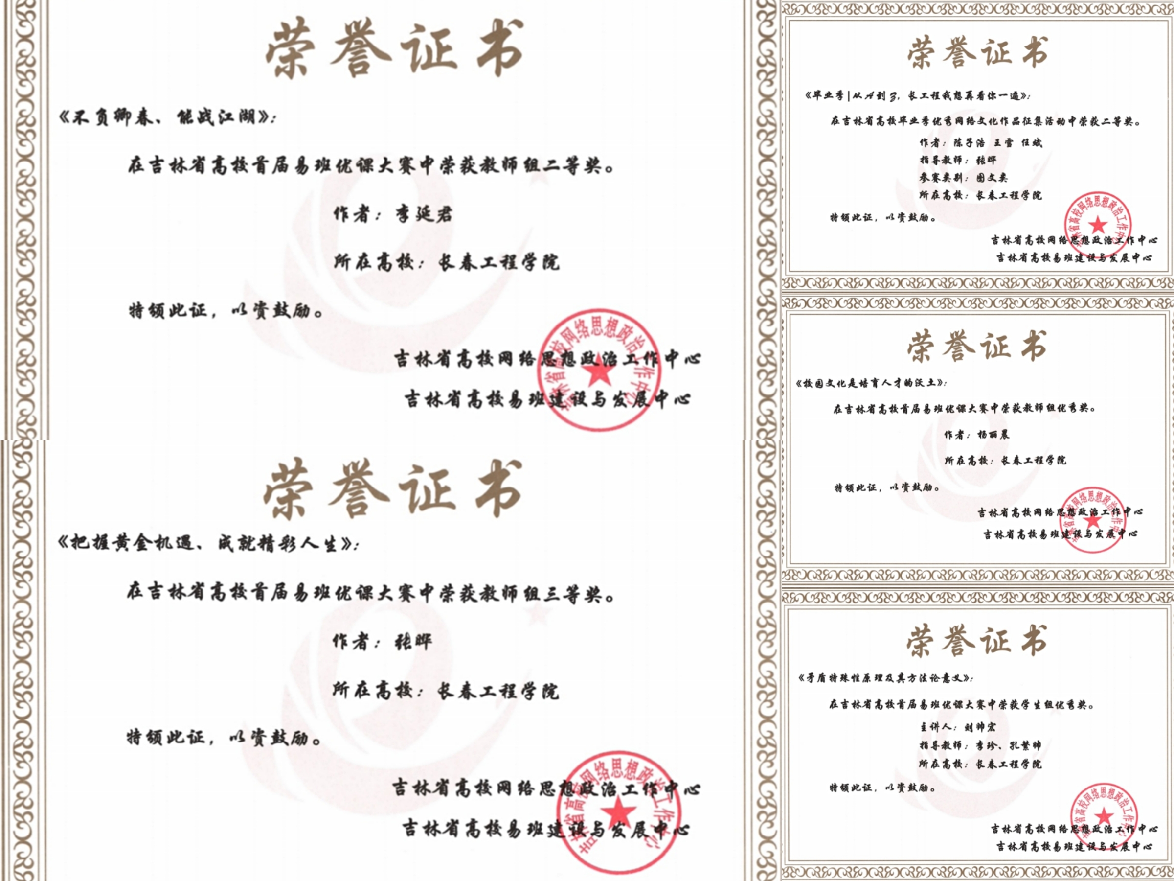 在吉林省高校毕业季优秀网络文化作品征集活动中,学生陈子浩、王雪、任斌制作的网络作品《毕业季|从A到Z,长工程我想再看你一遍》荣获图文类二等奖。在吉林省高校首届易班优课大赛中,土木工程学院教师李延君荣获教师组二等奖、党委学生工作部教师张晔荣获教师组三等奖、土木工程学院党委副书记杨丽晨荣获教师组优秀奖、能源动力工程学院学生刘帅宏荣获学生组优秀奖。