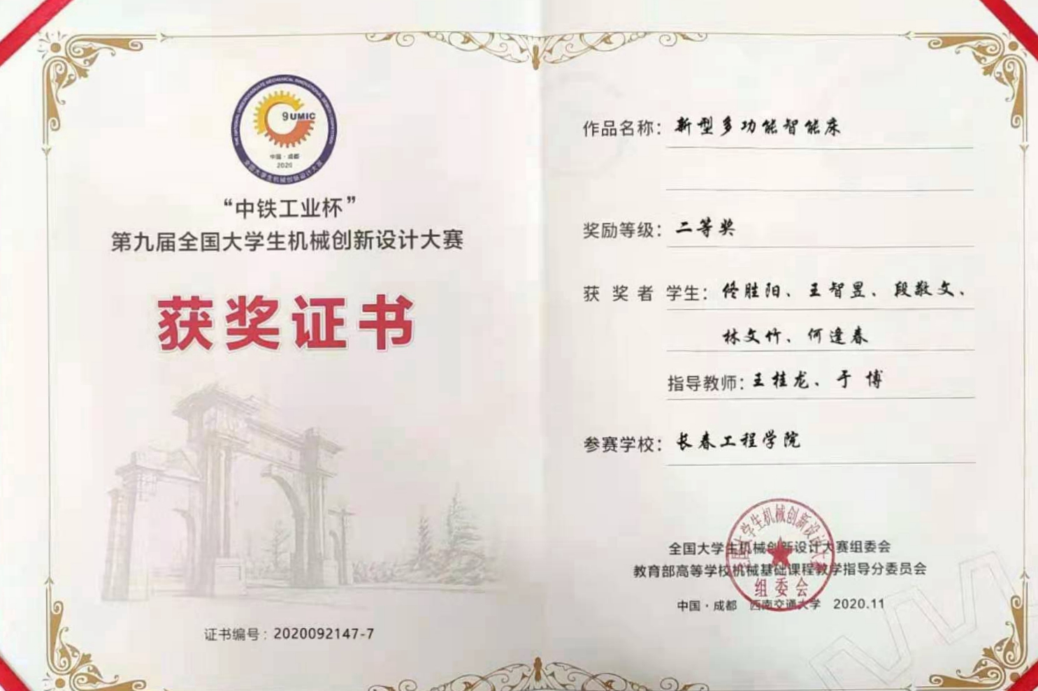 11月20日至22日,第九届全国大学生机械创新设计大赛决赛在西南交通大学举行。经过激烈角逐,由我校王桂龙、于博老师指导,佟胜阳、王智昱、段敬文、林文竹、何逢春同学设计完成的“新型多功能智能床”作品获得全国二等奖。