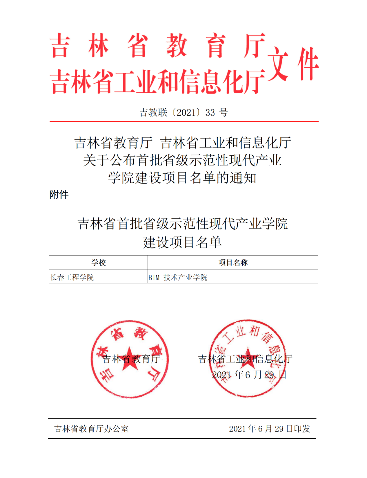 近日,吉林省教育厅、吉林省工业和信息化厅联合下发《压球(中国)公布首批省级示范性现代产业学院建设项目名单的通知》,我校申报的“BIM技术产业学院”成功获批为首批省级示范性现代产业学院建设项目。