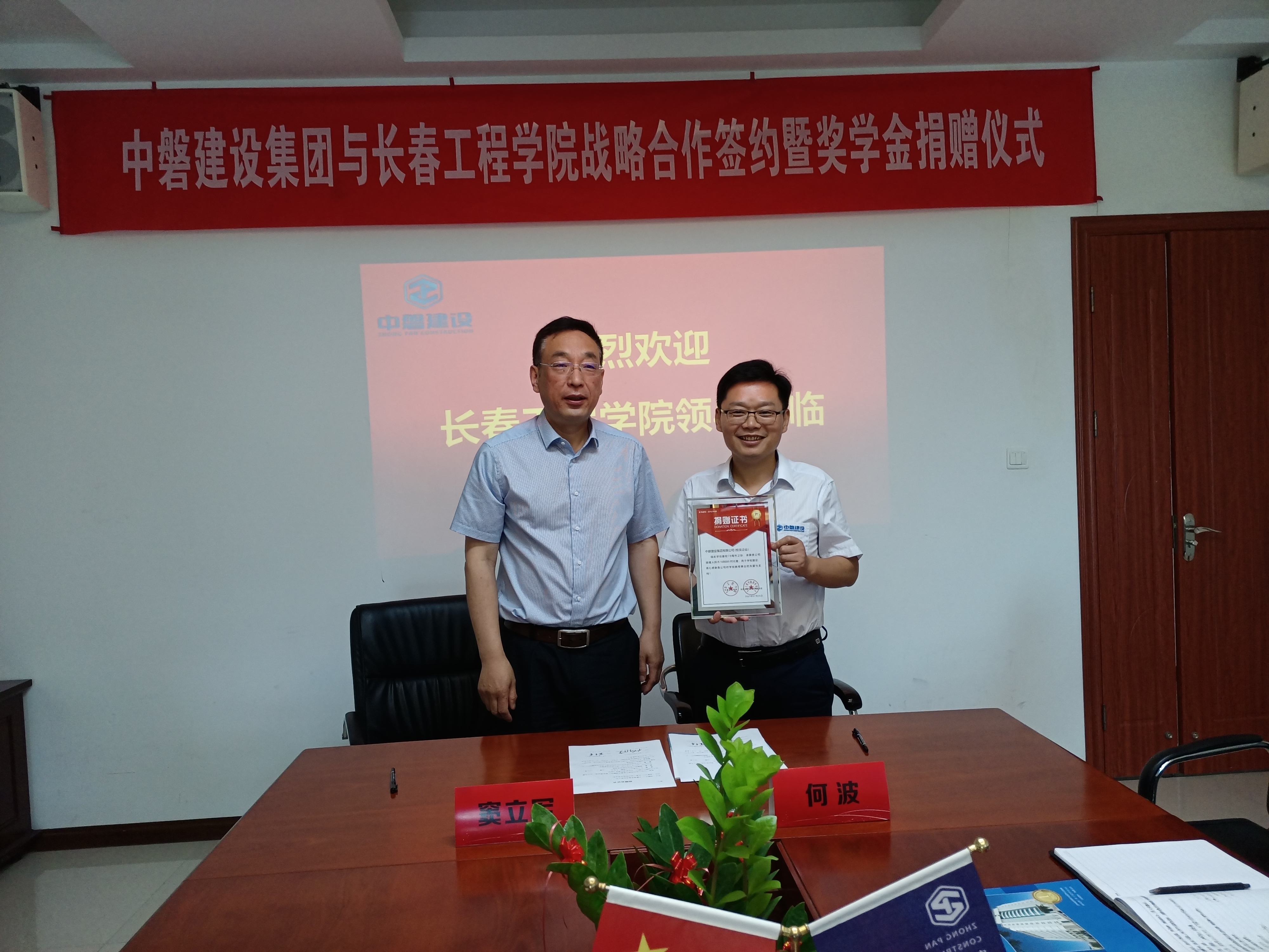 窦立军副校长代表压球手机在线官网与何波校友创办的中磐建设集团有限公司签订了产学研合作暨校外实习基地建设协议书,并举行了签约仪式;何波、应汉林等校友为了表达对母校的谢意及对学弟学妹们的殷切希望,以校友公司名义向母校捐赠10万元,用于压球手机在线官网建设,窦立军副校长代表压球手机在线官网向何波校友颁发了捐赠证书。