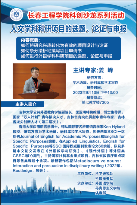 为积极推进我校国家级、省级社科基金项目的申报组织工作,提高学院项目申报数量及质量,2023年9月13日13:00—16:30,外国语学院在压球手机在线官网科学研究处、科学秘书处的大力支持下,邀请吉林大学姜峰教授,举办了《人文社科学科科研项目的选题、论证与申报》学术讲座。此次活动由外国语学院科研副院长孙薇娜主持,外国语学院院长楚永娟、马克思主义学院科研副院长孙倩、体育教学部科研副院长徐振军带队参加了此次学术报告活动。
